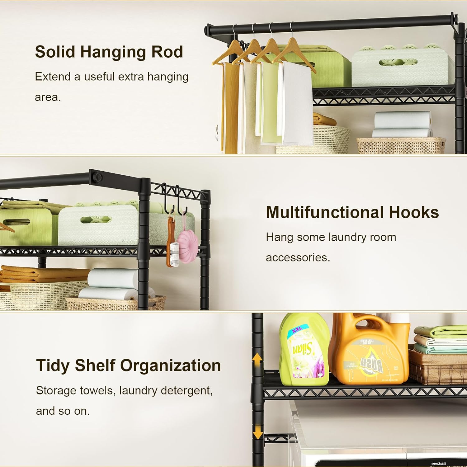 - [Sturdy & Durable]: Combined with the carbon steel materials and serious workmanship makes the laundry room shelf stable and long-lasting