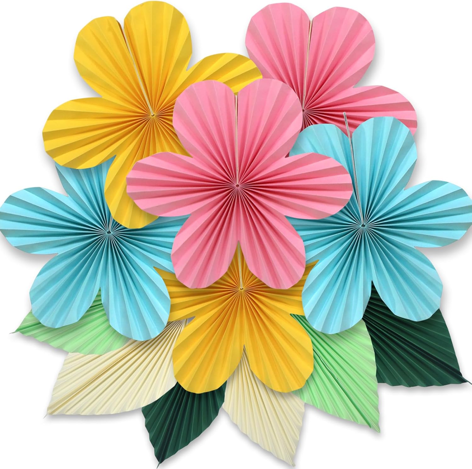 - Package contents: Hanging flower fans and leaves party decorations set includes 6pcs 12-inch paper flowers in yellow, pink, and blue colors. 6pcs paper leaves in green(diameter :12 "* 3/10" *3).