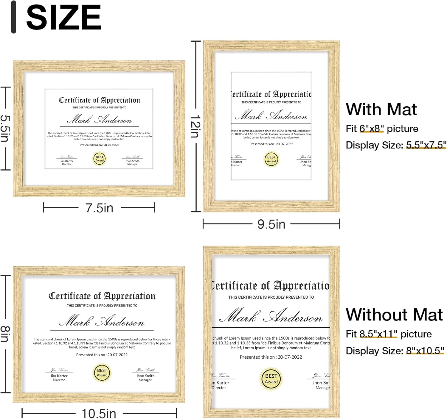 - Size: Each set includes nine 8.5x11 frames with white mats for 6x8 photos, or without the mat for 8.5x11 pictures. The frames are 0.78 inches wide and 0.5 inches thick. The opening of the frame and mat is slightly smaller than the picture itself