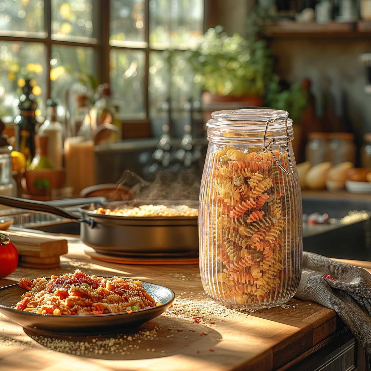 - Airtight Mason Jars: Glass jars with airtight lid is made of food-graded glass; Each kitchen canisters for countertop is well sealed, equipped with silicone gasket and a stainless iron locking clamp to make sure your food stay clean and fresh in storage