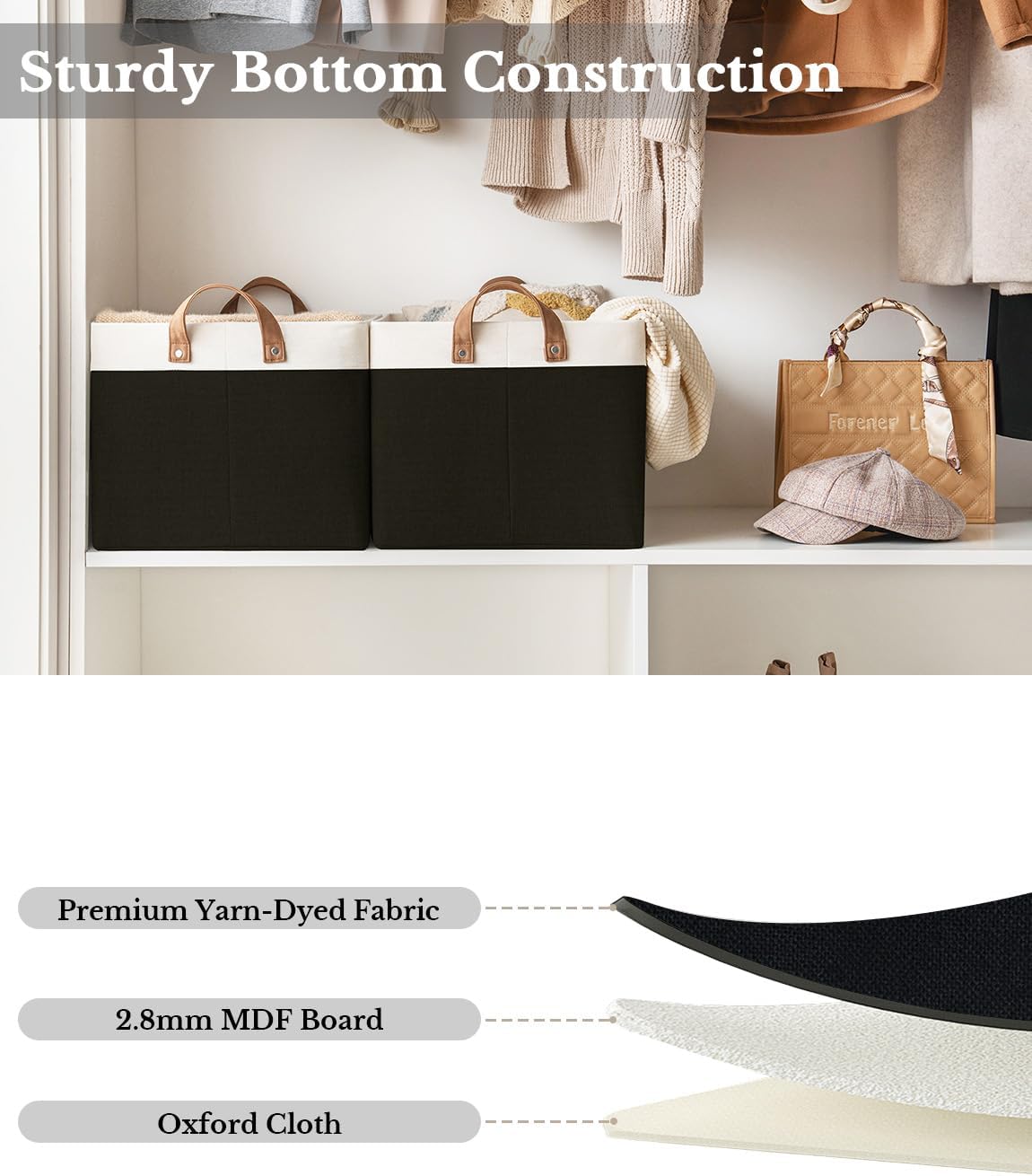 - Premium Quality: Made from high-quality fabric and reinforced with a heavy-duty MDF bottom board and a sturdy metal frame. The solid construction enables the storage bins to stand upright without support, even when empty.