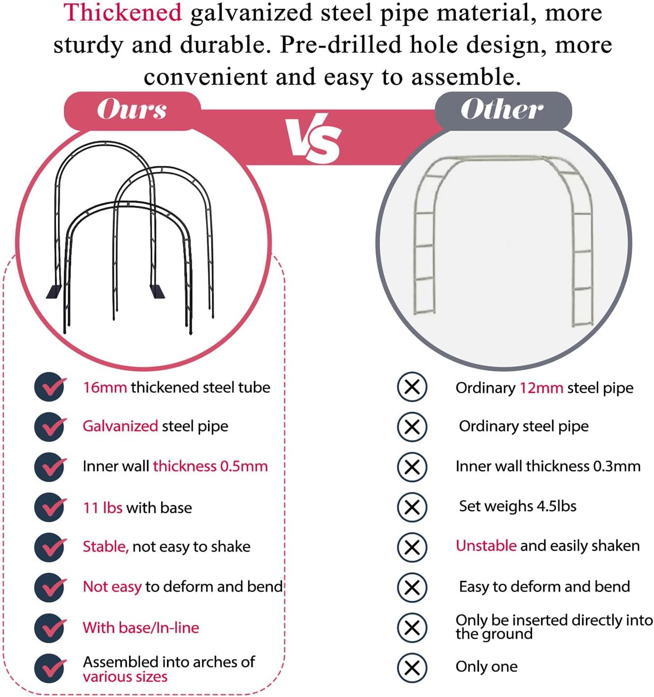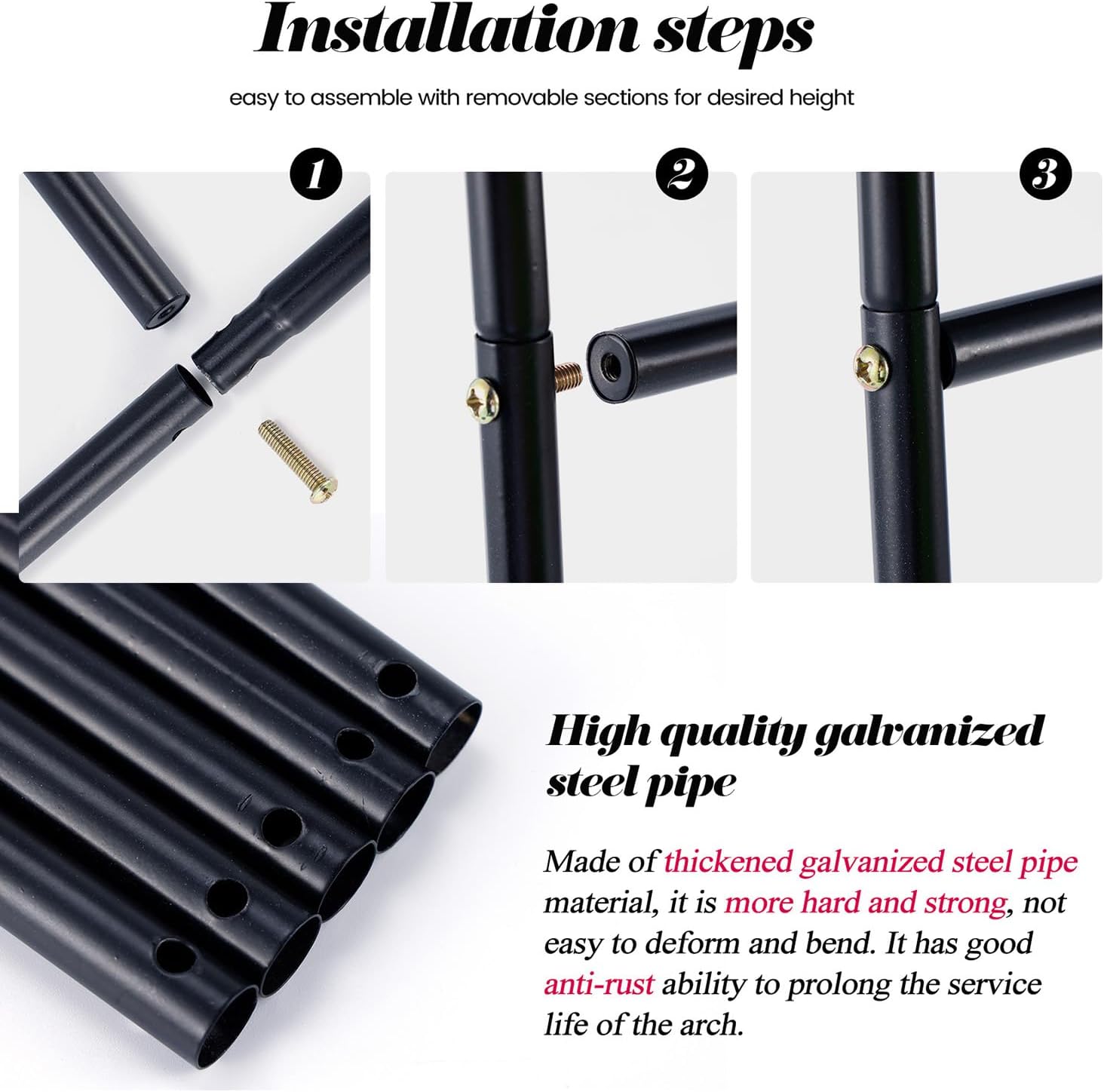 - STURDY MATERIAL: Made of better quality; tougher and rust-proof galvanized steel tubes. The inner wall of the steel pipe is thickened to 0.5 mm; which is twice as heavy as the ordinary products and not easy to bend; deform and tilt. Can be used for wedding arch; garden arch trellis; garden arbor