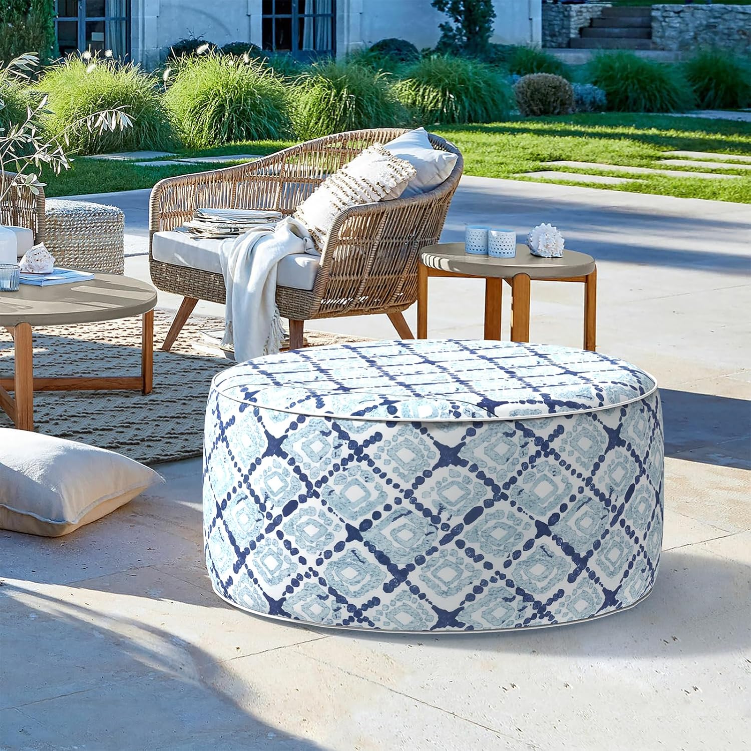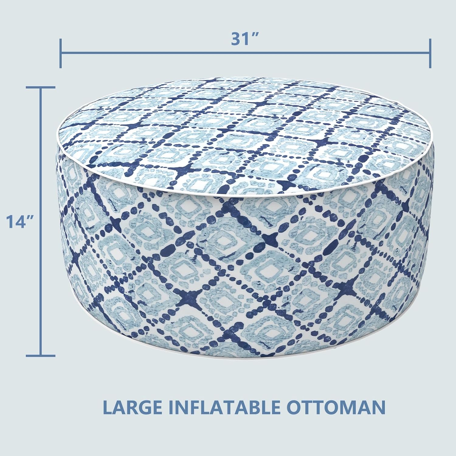 LVTXIII Outdoor Inflatable Ottoman, Fade-Resistant Round Footrest Stool D31”x H14”, Portable Patio Pouf for Garden Camping or Home Use, Boho Geometry Blue