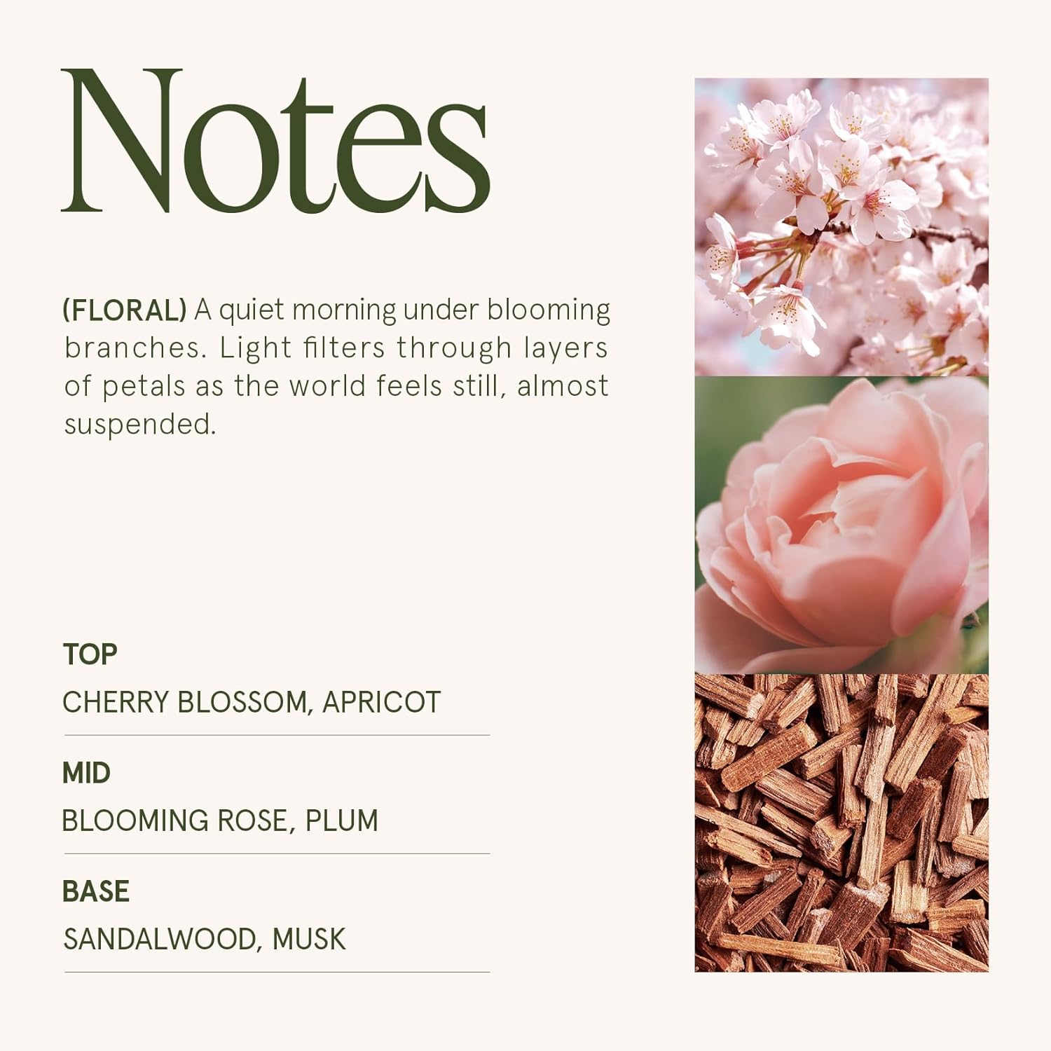 - CHERRY BLOSSOM DREAM - This cherry sakura candle blends Sweet Orange, Cherry Blossom, and apricot with Blooming Rose and Plum. Finishing up with warm Sandalwood and Musk to create a dreamy scent,like a spring summer picnic under a blossoming cherry tree
