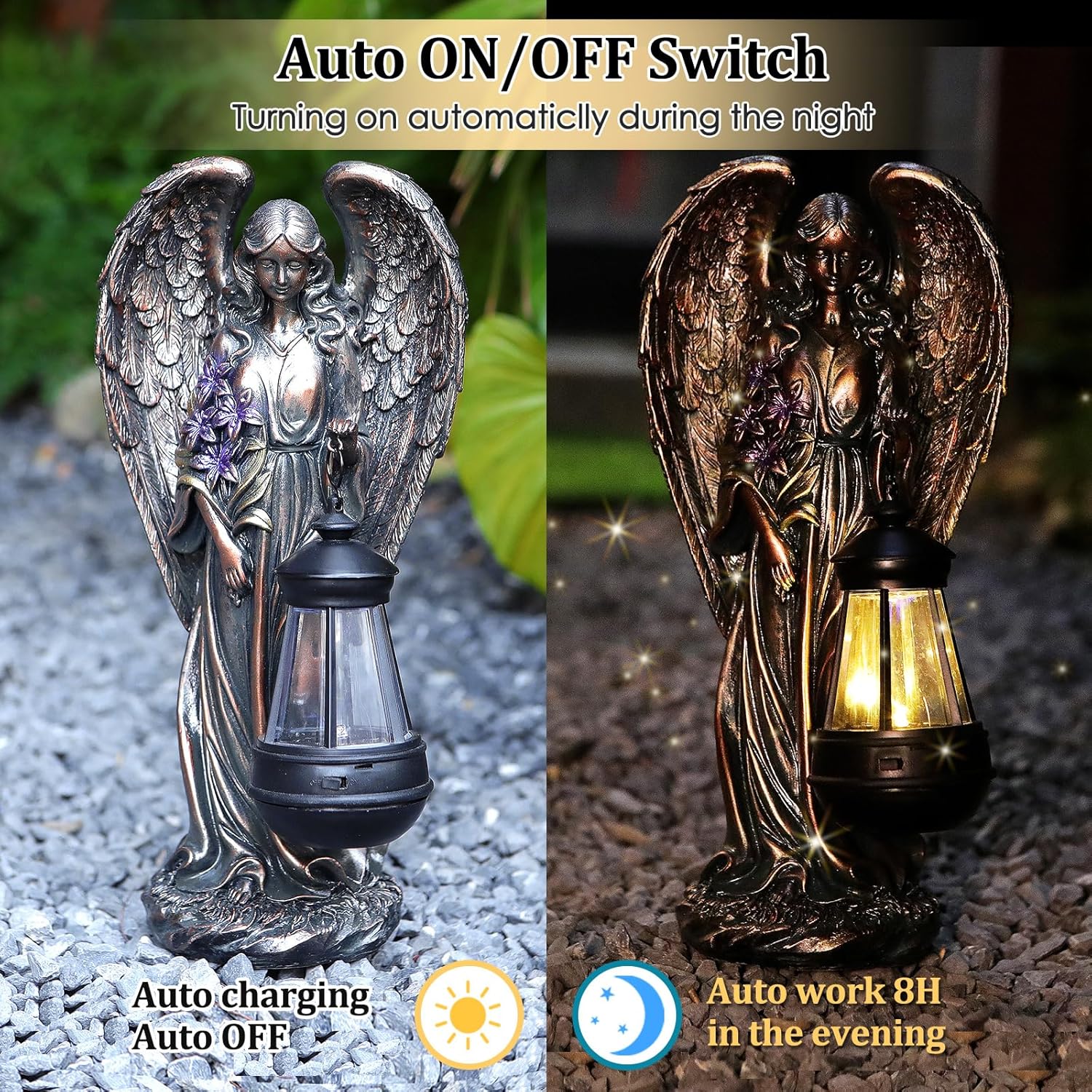 - 【Easy to Use】The garden angel statues are incredibly easy to use. Simply press the button at the bottom and leave it in the 'on' position during the day. The solar panel will then charge, and your statue will light up automatically at night, creating a hassle-free outdoor decoration experience.