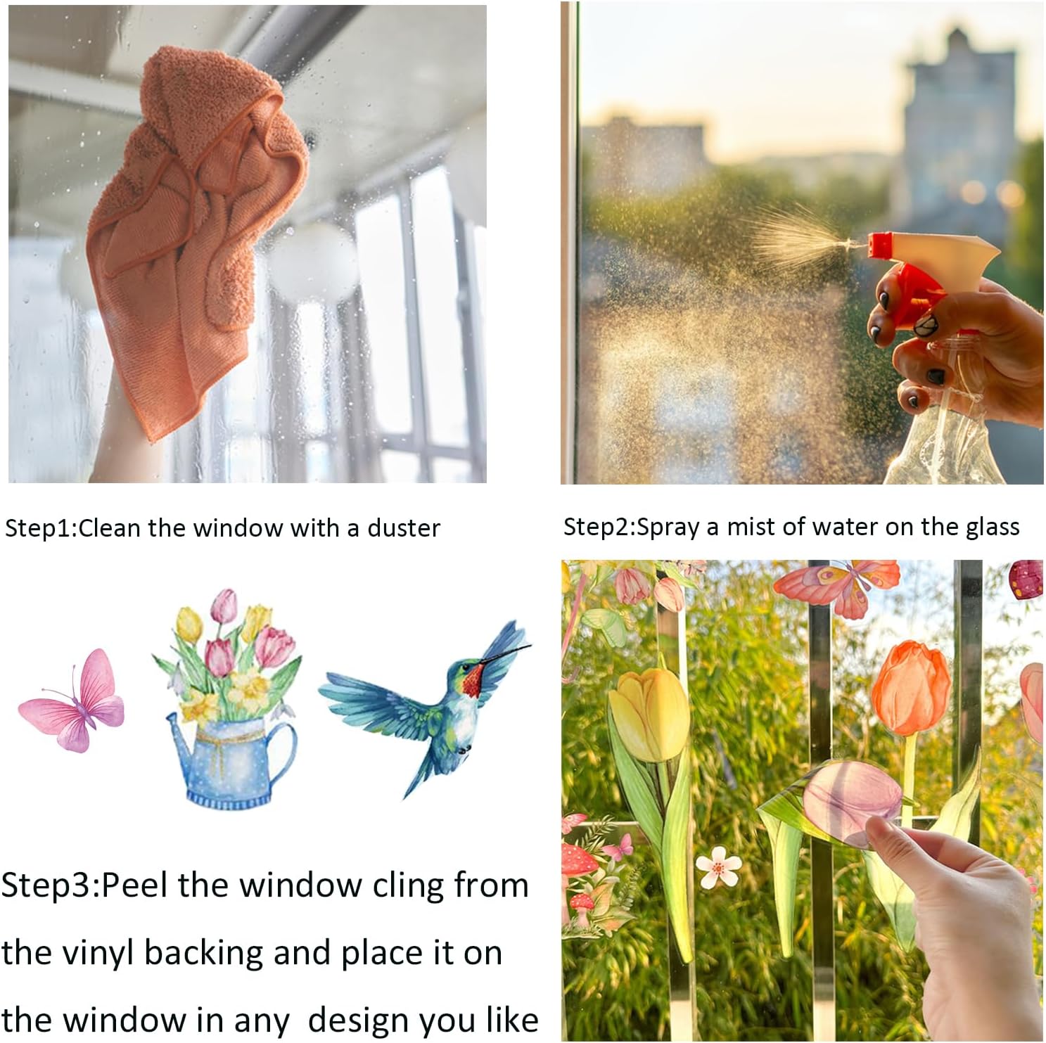 - Package content: you will receive 8 sheets of spring window clings with different vibrant patterns, and flower clings are about 3.1 x 7.6 inches and butterfly clings are about 3.3 x 2.5 inches, proper size for decorating glass panels, patio doors or windows and creating a cheerful spring party atmosphere