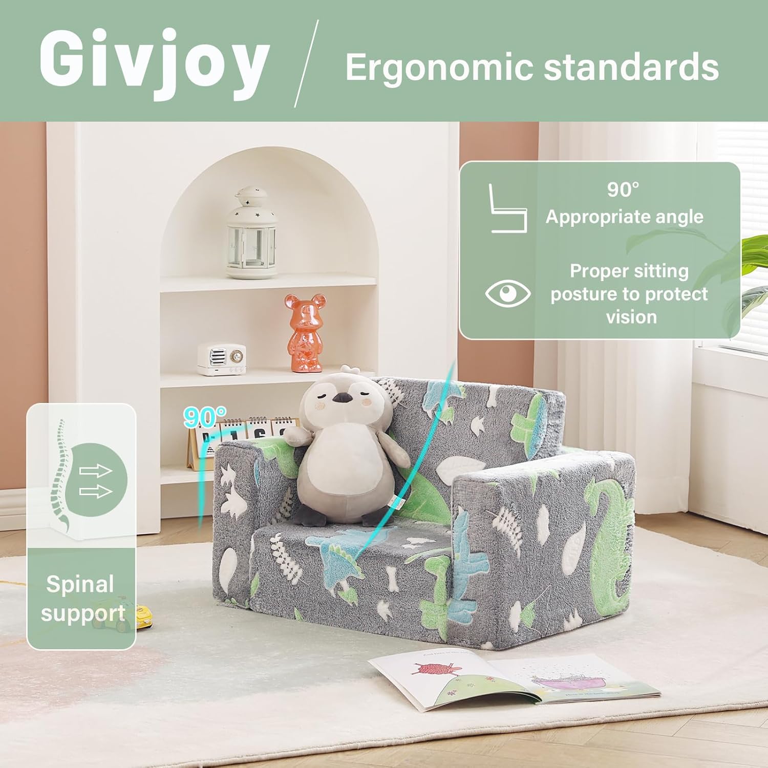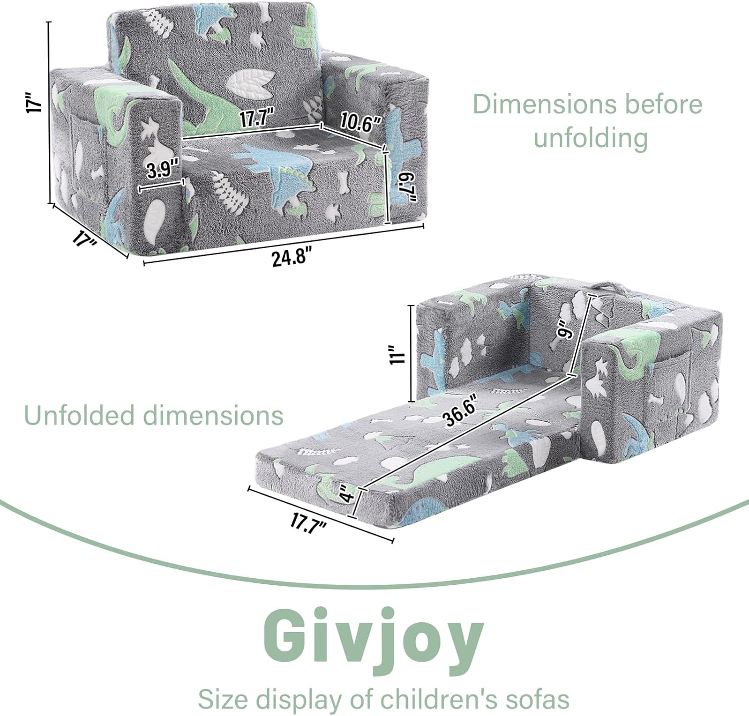 Toddler Chair Kids Couch, 2-in-1 Toddler Soft Sherpa Couch Fold Out Armchair with Removable Cover, Convertible Reading Chair Toddler Sofa for Kids, Glow in The Dark Plush Grey Dinosaur
