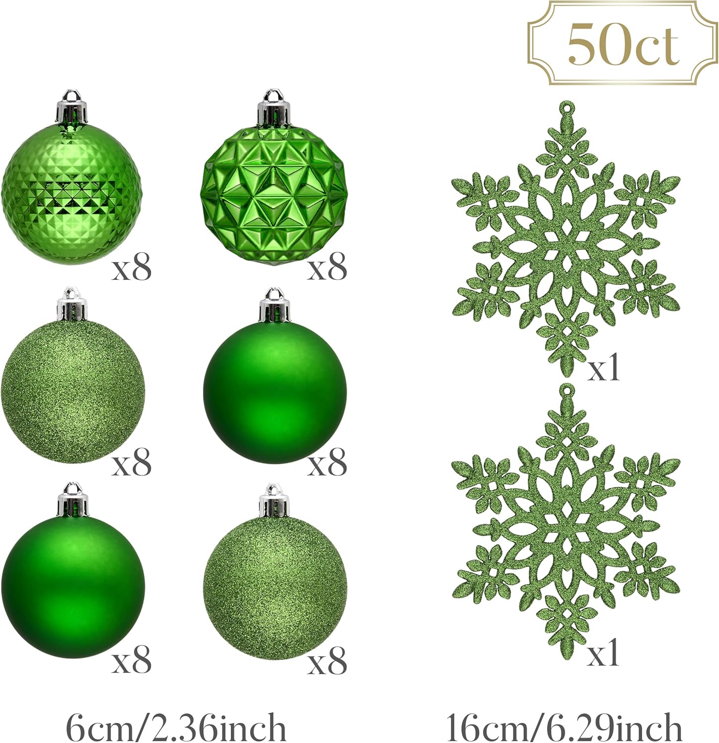 - 【Package and Size】This ornament ball set include 50pcs Christmas ornaments measuring 2.36 inches in diameter, featuring seamless connections for a polished look