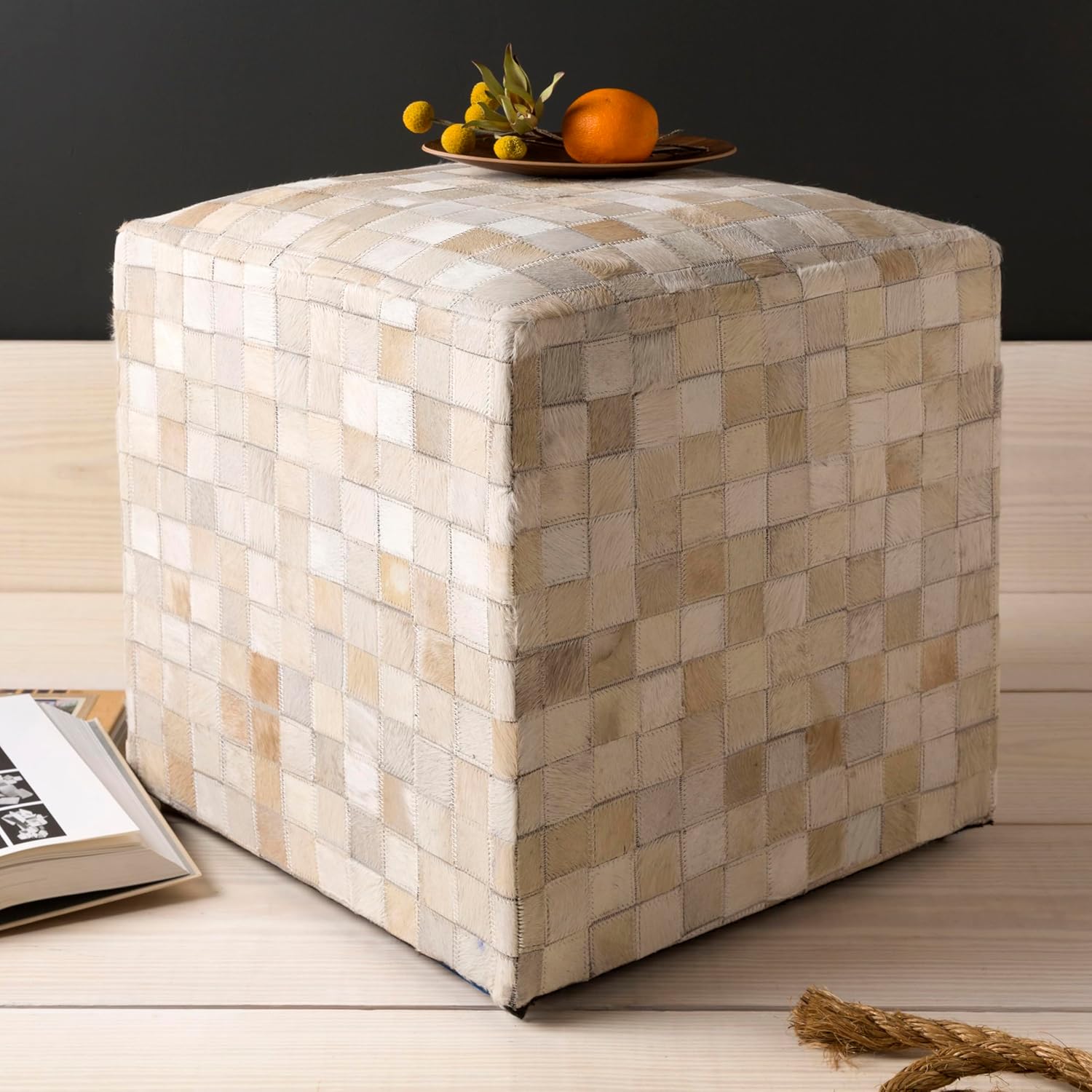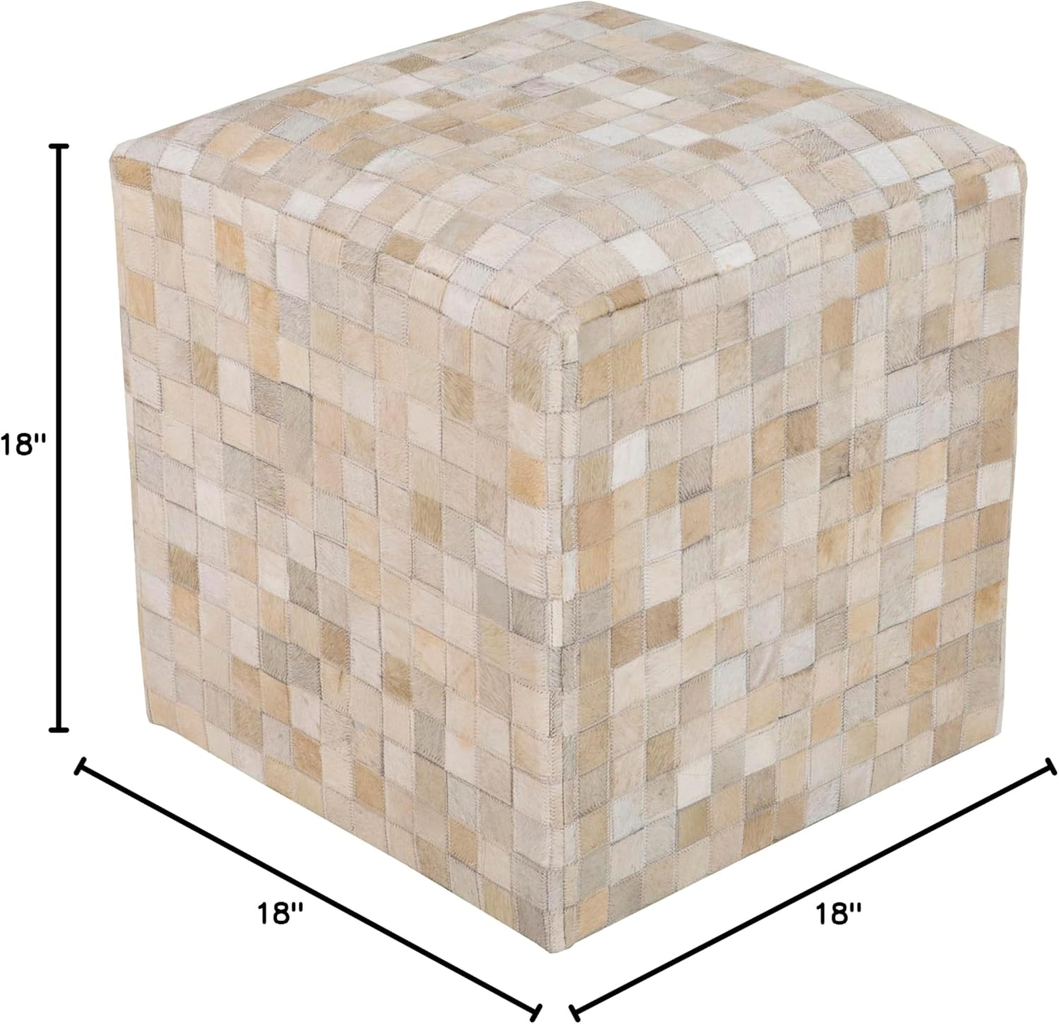 - 【PRODUCT SPECIFICATIONS】Colors: Cream, Camel | Dimensions: 18"H x 18"W x 18"D | Style: Hide Leather and Fur | Shape: Cube | Construction: Leather