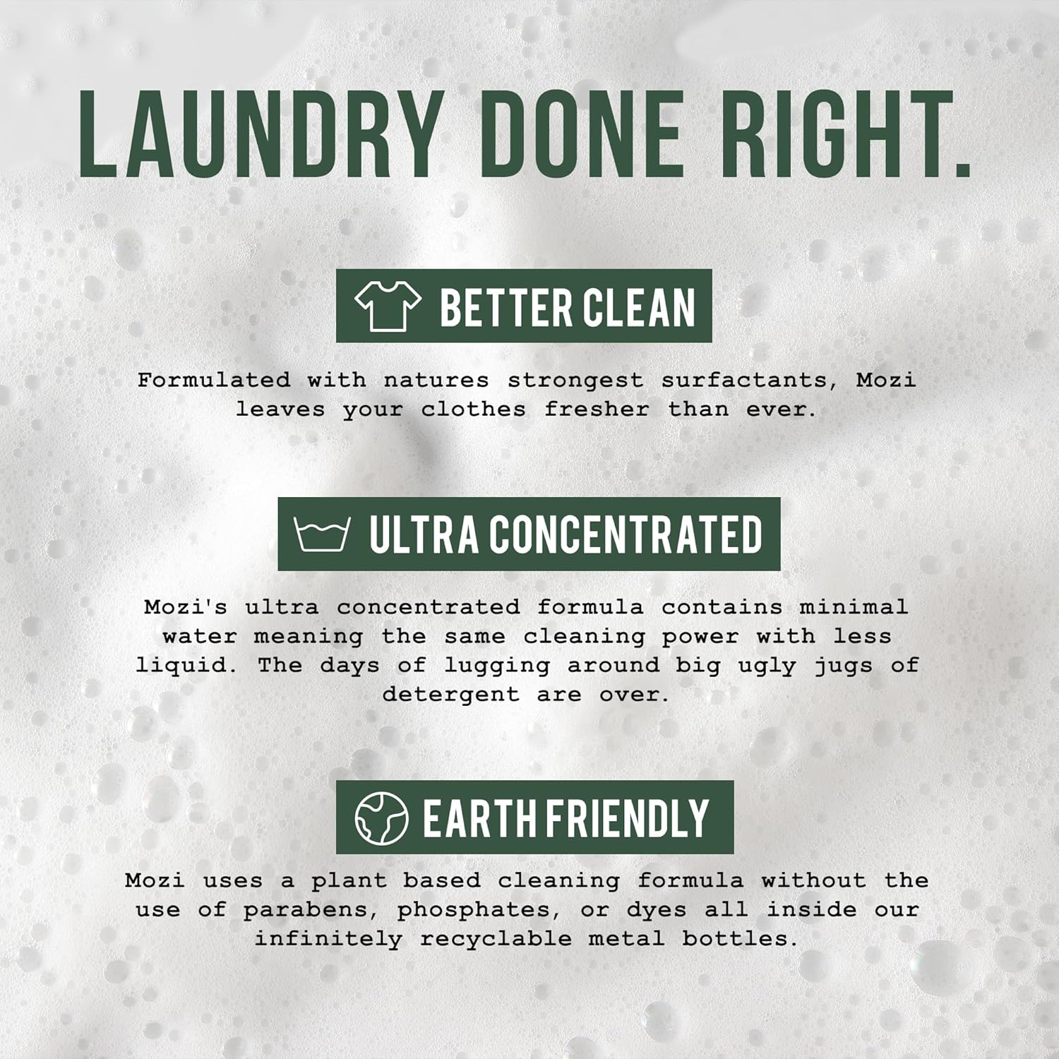 - EARTH FRIENDLY & MIXED IN LOS ANGELES: Crafted with a non toxic, cruelty free formula, Mozi is free from dyes, parabens, and phosphates. Packaged in recyclable metal bottles and made fresh in Los Angeles, it’s eco-friendly laundry detergent that looks as good as it performs.