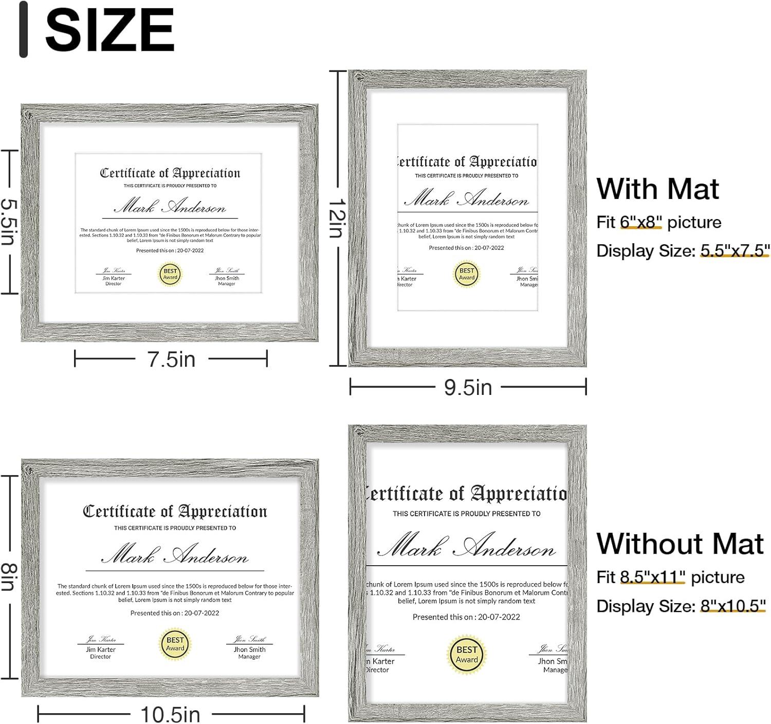 - Size: Each set includes nine 8.5x11 frames with white mats for 6x8 photos, or without the mat for 8.5x11 pictures. The frames are 0.78 inches wide and 0.5 inches thick. The opening of the frame and mat is slightly smaller than the picture itself