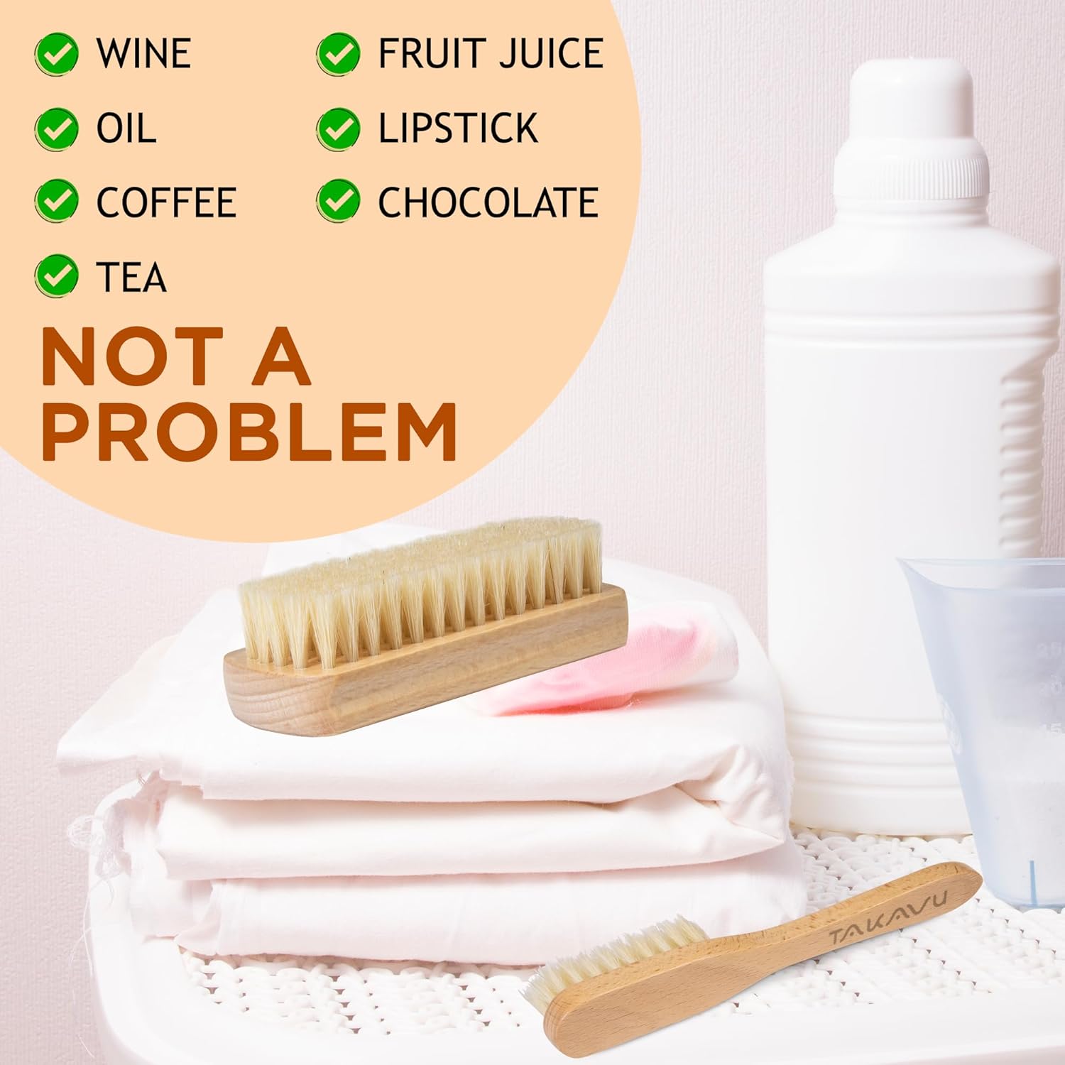 - Use & Care: Wetting the brush and stained area then apply the stain removers. Wait for a few minutes for the detergent to soak on the fabric, then use a TAKAVU laundry brush to gently scrub on the surface, and wash the stained area by hand again to remove the dirt. After use, simply raise the brush with warm water and some mild detergent, and let them dry to facilitate the next use.