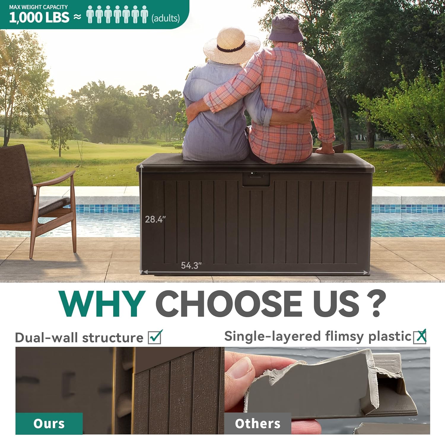 - Double-Layer Structure: Our all-weather resin deck box stands out with a double-layer structure and enhanced with internal reinforced steel beams, providing durability and resilience for outdoor use