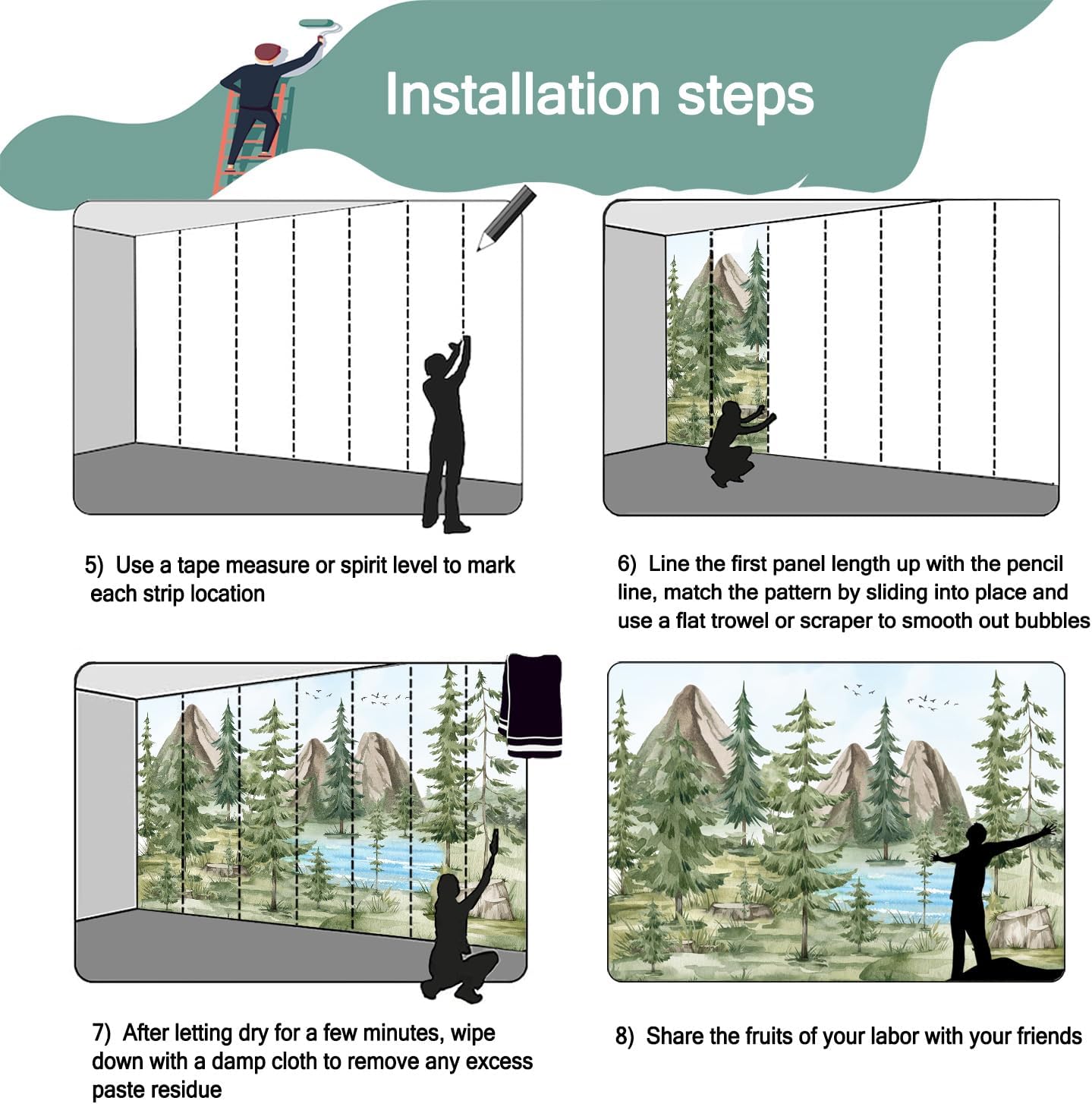 - Mural wallpaper size: 100 "W x 65 "H, divided into 5 sections, each section is labeled with a number underneath, there is no need to overlap the pattern when installing, just install according to the number labeled underneath the panel