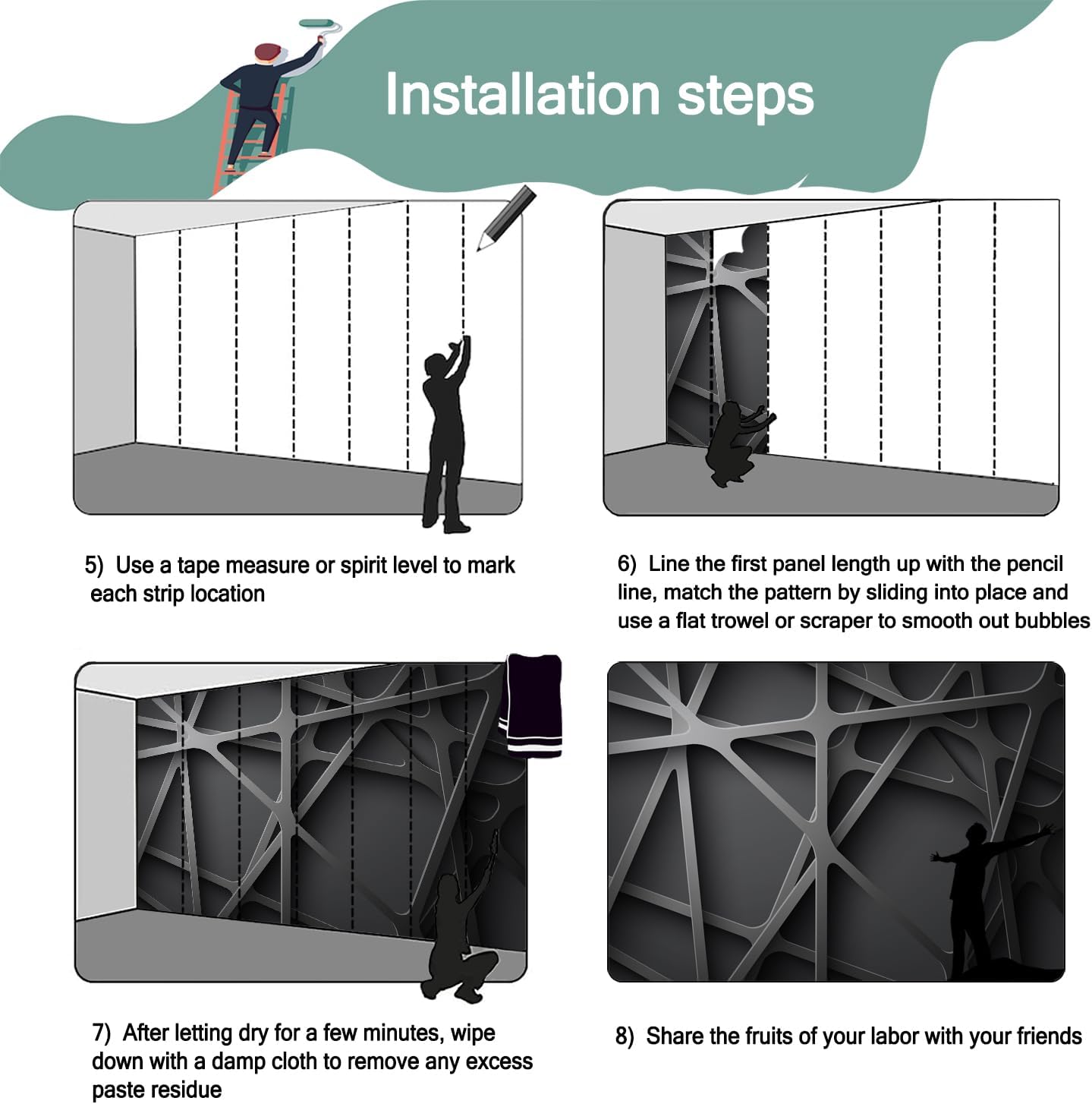 - Mural wallpaper size: 140 "W x 91 "H, divided into 7 sections, each section is labeled with a number underneath, there is no need to overlap the pattern when installing, just install according to the number labeled underneath the panel