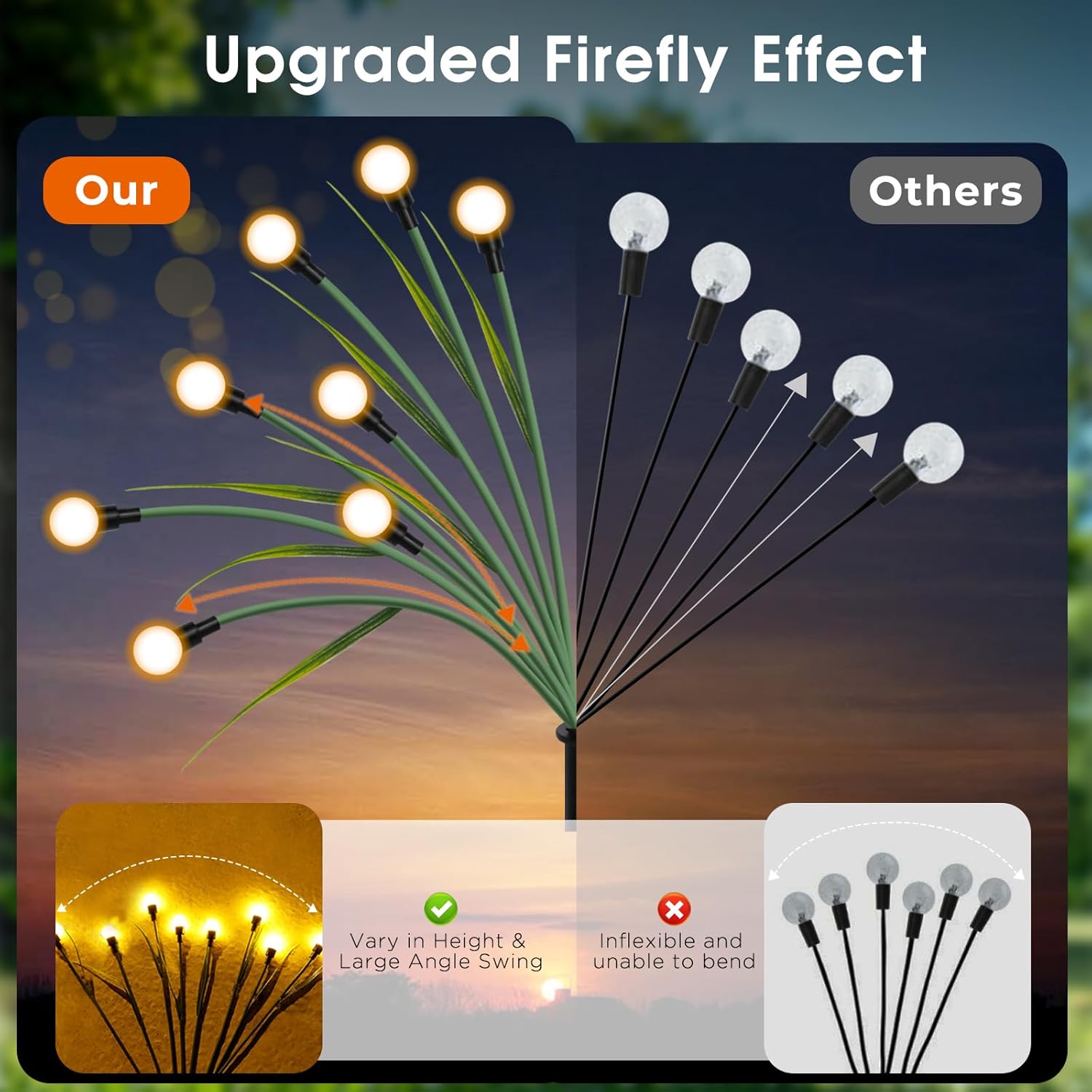 - Simulated Leaves and Differernt Heights: Our latest design of solar garden lights with simulated plant appearance can perfectly integrate with the environment no matter day or night, and your garden will still shine after nightfall.The heavy-duty bulb base enhances the swaying power, creating a charming swaying effect. When the wind blows, patio lights will swing with the wind, just like a real firefly dancing in the yard.