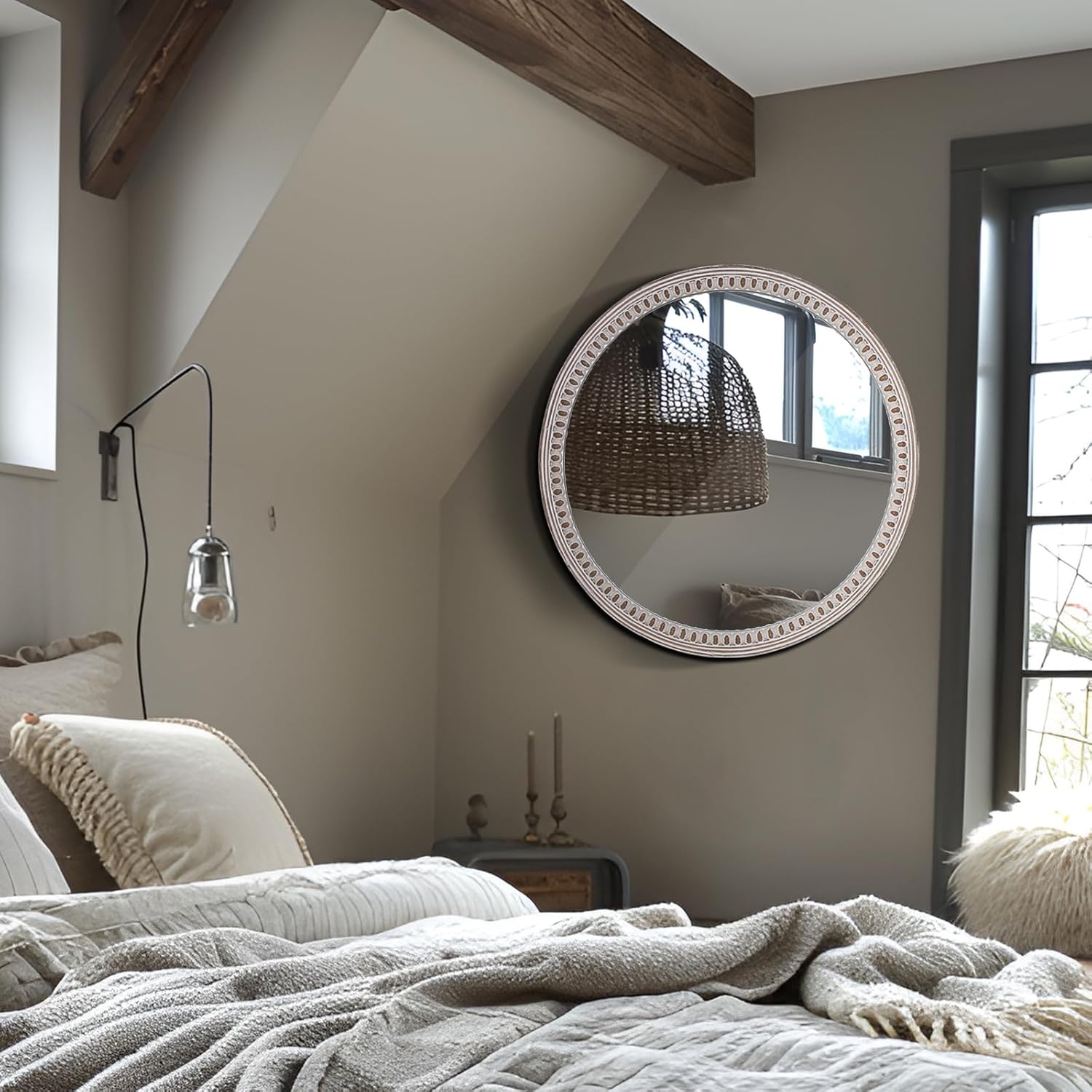 - Rustic Farmhouse Design: This 24-inch decorative all mirror features a wooden round frame with bead accents, bringing a touch of rustic farmhouse charm to your living room, entryway, or bathroom. The distressed finish adds character and warmth to any space.