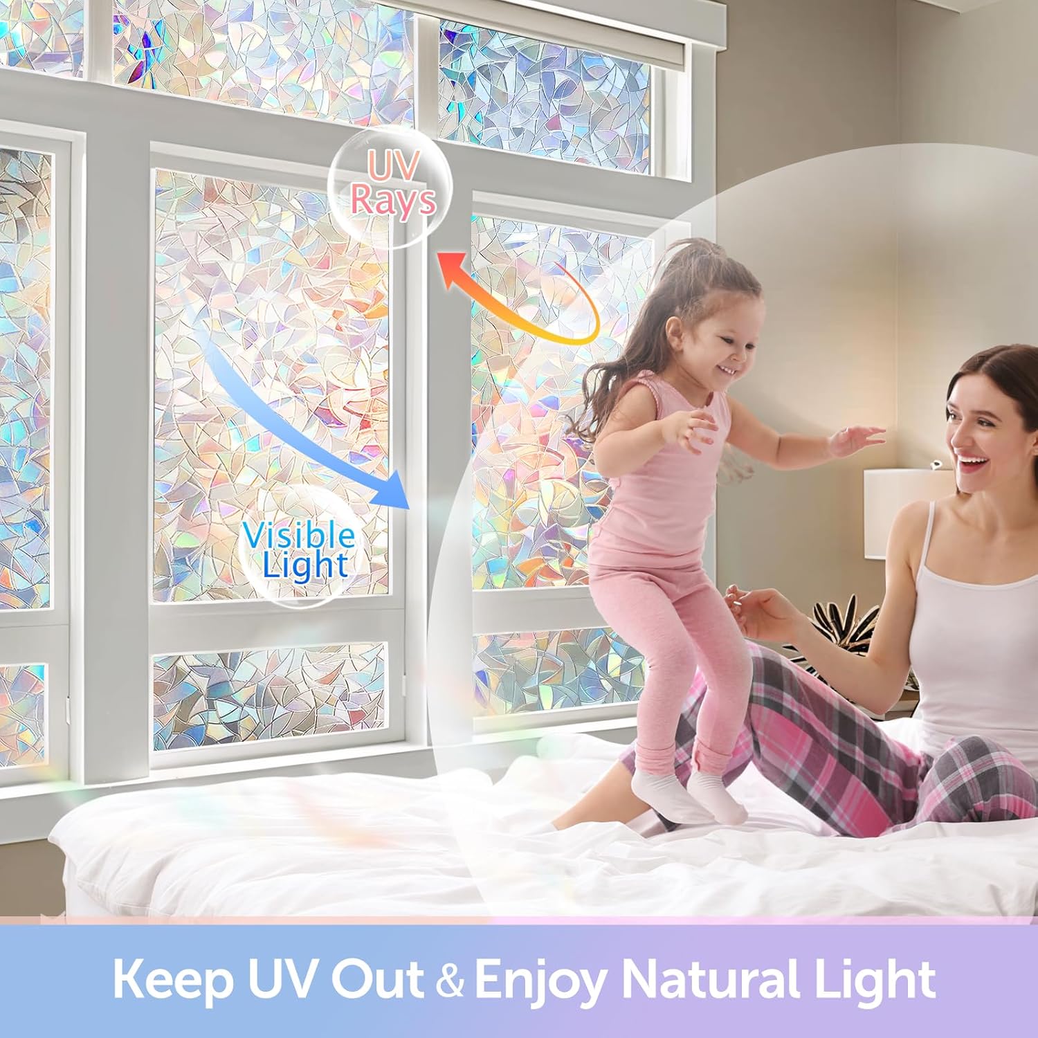 - ECONOMICAL & WIDE APPLICATION: No more heavy and troublesome curtains and blinds, simple decorative window film makes life more convenient and better. Suitable for all smooth and clean glass surfaces in office, bedroom, living room, kitchen, balconie, cabinet, glass door, hotel, etc. Double-layered glass, frosted glass and other treated uneven glass is not applicable for rainbow window privacy film.