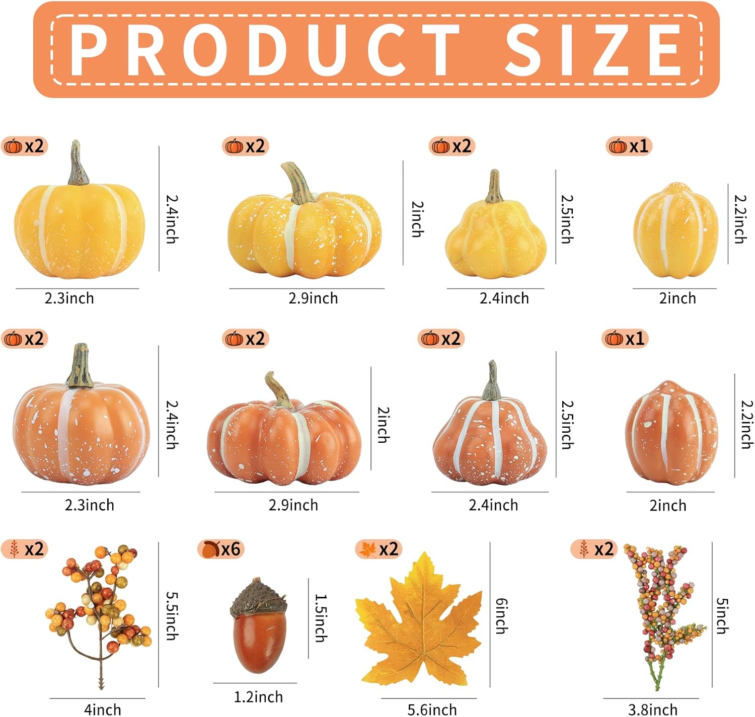 - 【Package Included】10 faux pumpkin, 6 acorns, 4 berries, 2 maple leaves. Total 22 pcs, covers all of your fall decorations for home needs.