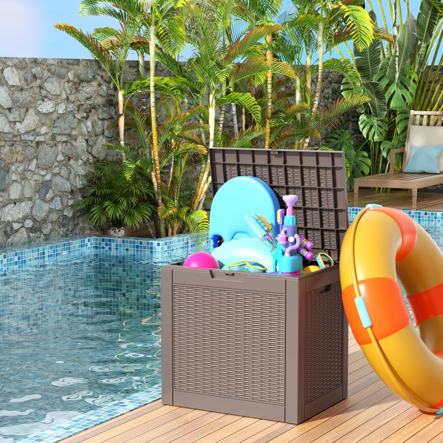 - Wicker Design: This resin storage box features a wicker pattern design, making it an excellent decoration for patios, gardens, yards, porches, and poolside areas.