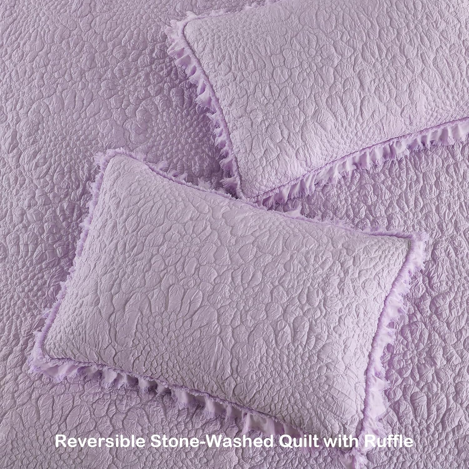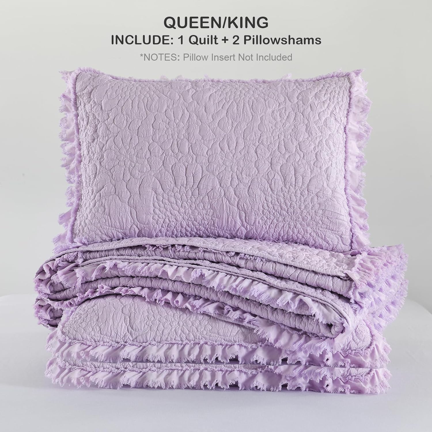 HORIMOTE HOME Lavender Ruffled Quilt Queen Size, Stone-Washed Microfiber Lightweight Crinkled Farmhouse Rustic Shabby Chic Bedding Set, 3 Pieces Reversible Bedspread with Pillow Shams for All Season