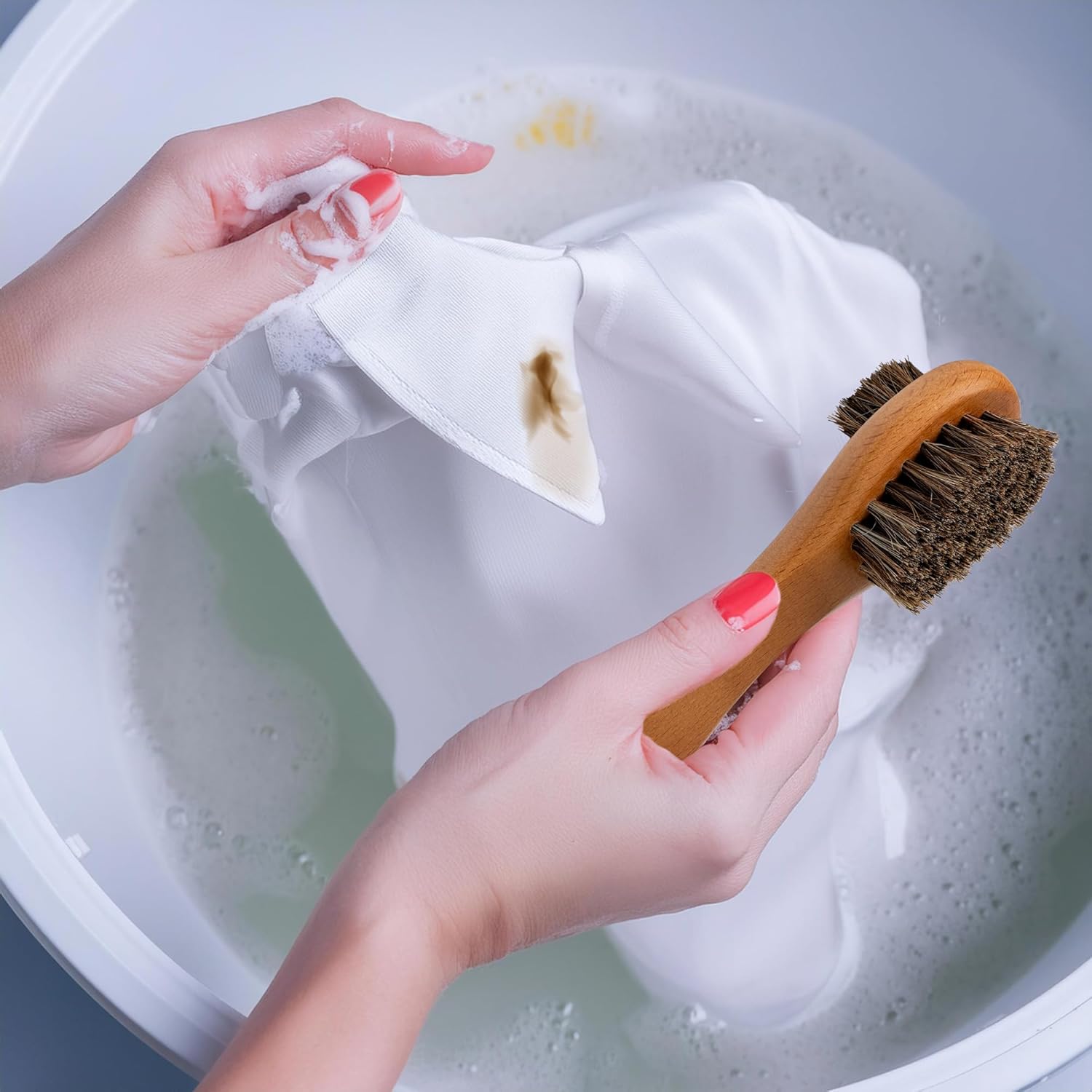- Intensive dual-bristle cleaning power: Each 6.5 x 2-inch laundry brush features a unique double-bristle design. Densely packed natural horsehair offers strong, stable scrubbing force – the larger side tackles heavy soiling while the smaller side provides a gentler touch for detailed or delicate spot cleaning.
