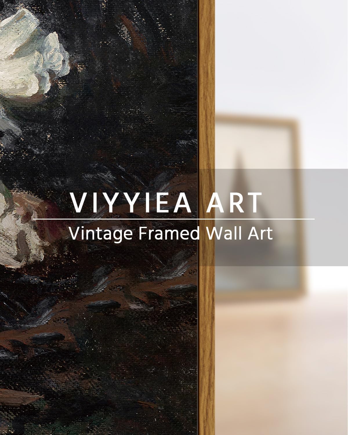 VIYYIEA Framed Canvas Wall Art Home Decor Vintage Botanical Print White Roses in Vase Rustic Farmhouse Flower Wall Decor Mid Century Pictures Decor Art Prints Floral Room Decor for Living Room 16x24in