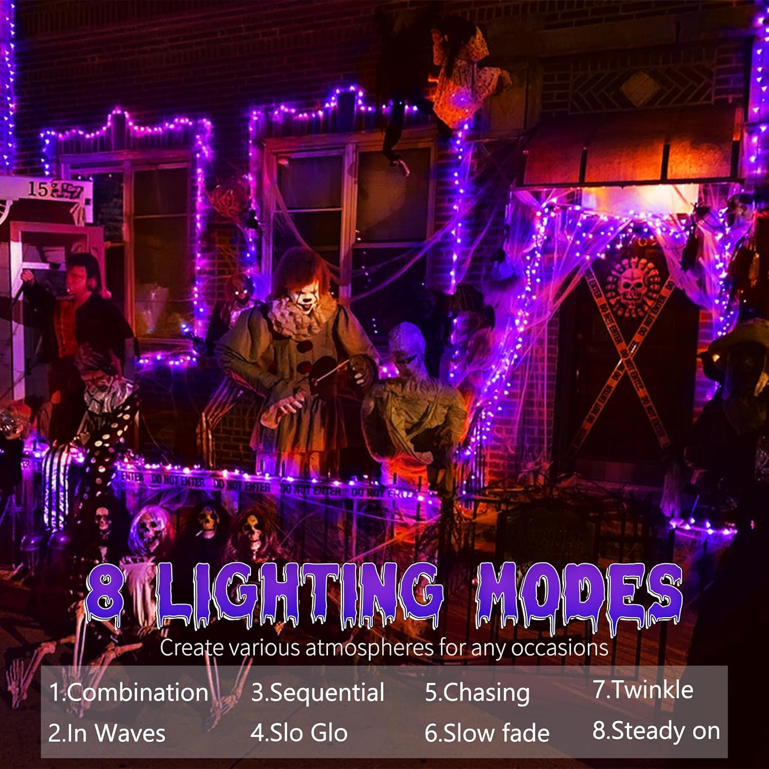 - 8 Lighting Modes purple Halloween Lights: These mini globe Halloween lights feature 8 lighting modes, including Combination, In waves, Sequential, Slow Glow, Chasing/Flash, Slow fade, Twinkle/Flash, Steady on. Just press the round button on the adapter to set up your mode to fit your Halloween/holiday party decor or light up a unique outdoor/indoor illuminated backdrop for your vivid and funny decorations.