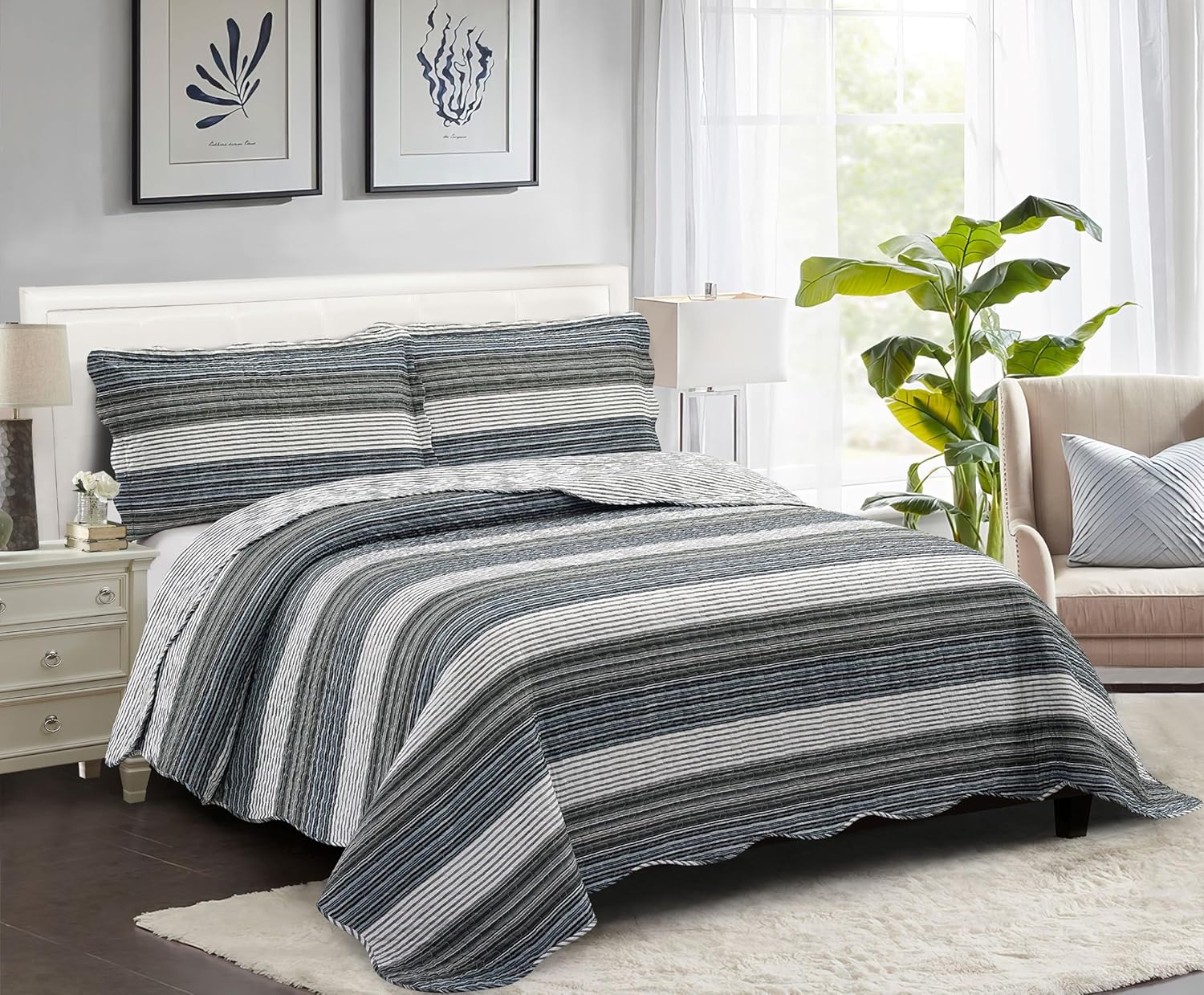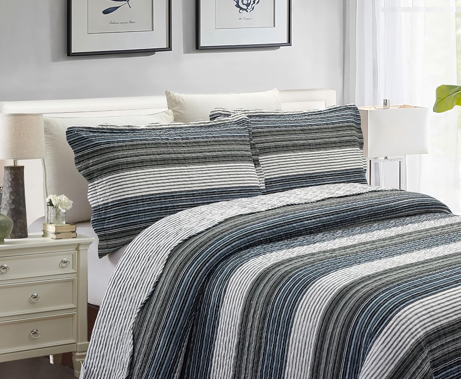Brilliant Sunshine Multi Grey Stripes Patchwork, 3-Piece Quilt Set with 2 Shams, Reversible Bedspread, Soft Lightweight Coverlet, All-Season, King, Multi Grey