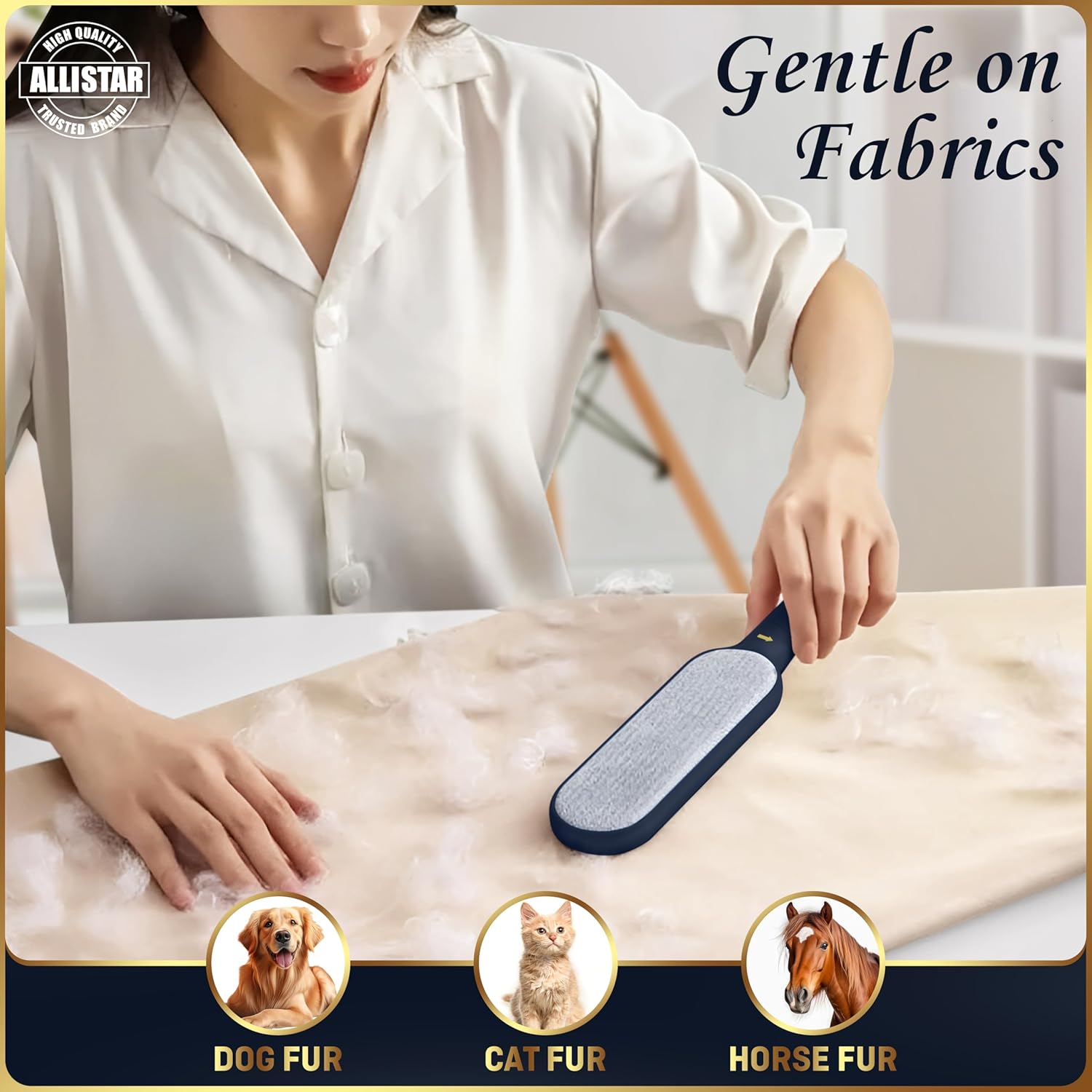 - DOUBLE SIDED ACTION - Larger sized brush allows for faster removal of unwanted pet fur and lint; The electrostatic design is gentle enough on delicate fabrics but strong enough to tackle tough cleaning jobs. ALLISTAR’s lightweight design can go anywhere you go and has a handle that can be suspended on a hook for a great storage space saver.