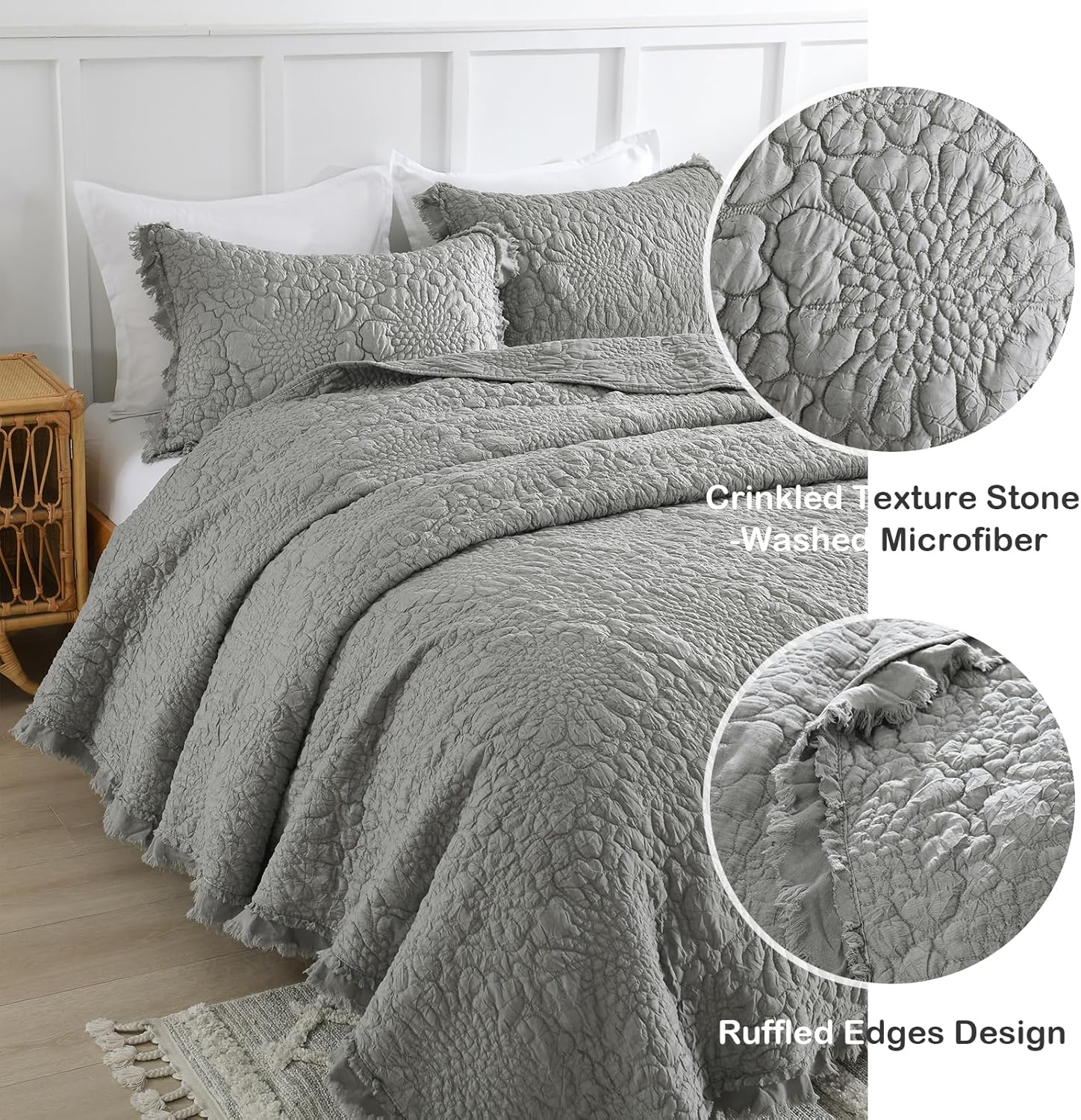 HORIMOTE HOME Dark Grey Ruffled Quilt Twin Size, Stone-Washed Microfiber Lightweight Crinkled Farmhouse Rustic Shabby Chic Bedding Set, 2 Pieces Reversible Bedspread with Pillow Sham for All Season