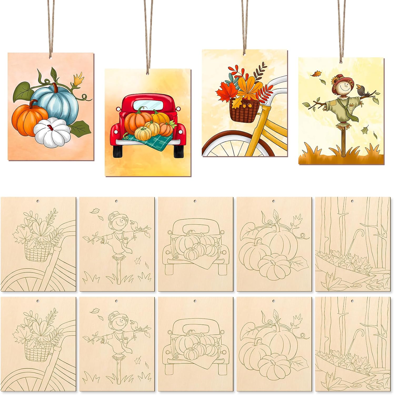 COCHIE 10PCS Large Fall Unfinished Wood Crafts to Paint for Adults Kids, Bulk Predrilled Wooden Ornaments for Painting, Pumpkin Scarecrow Maple Leaf Paintable Wood Slices Craft Supplies with Ropes