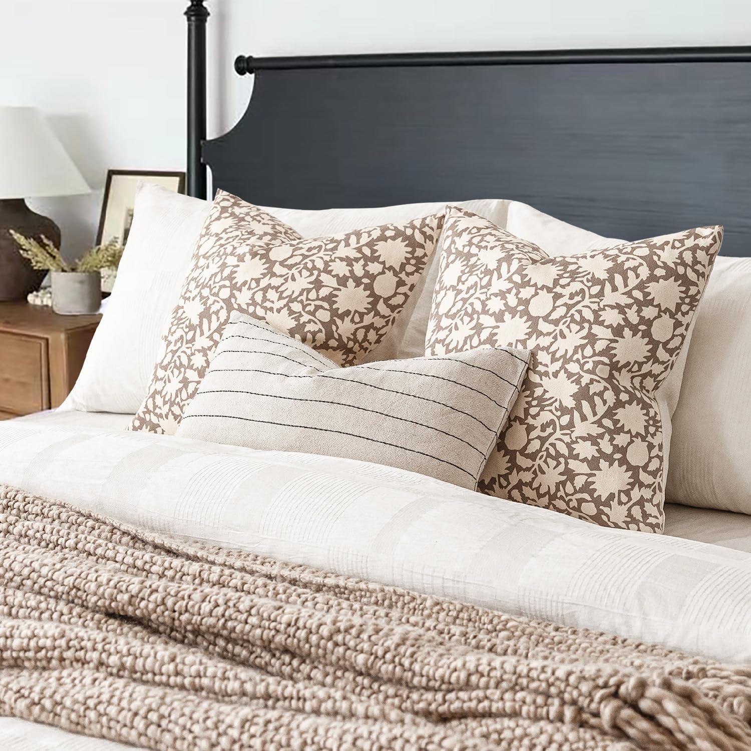Foindtower Set of 2 Decorative Neutral Floral Throw Pillow Covers Accent Farmhouse Cushion Covers Boho Vintage Pillowcase for Couch Sofa Bedroom Living Room Home Decor Outdoor,20×20 Inch,Tan