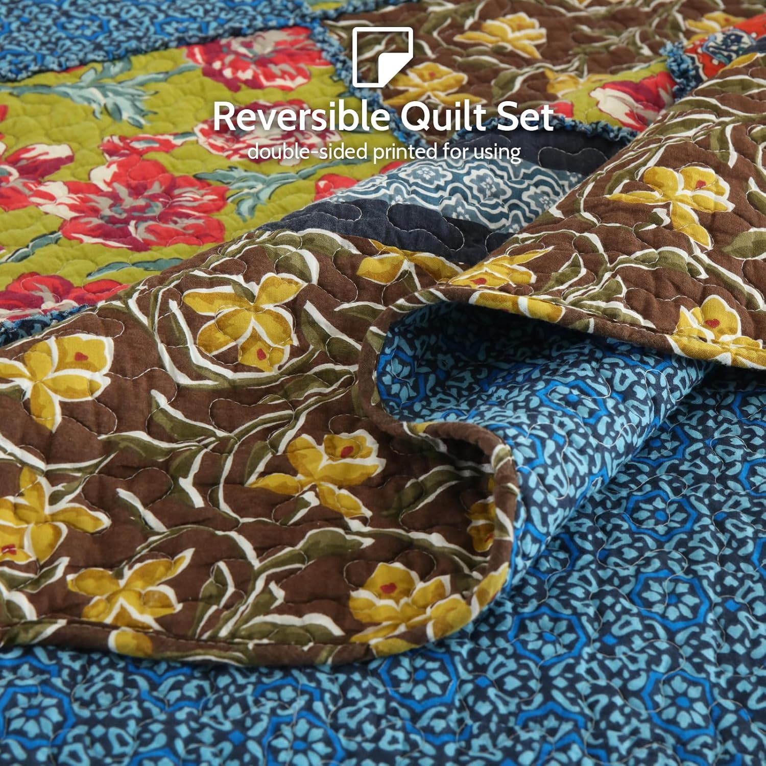 - UNIQUE QUILT SET: The patchwork quilt set is real stitched with many different patterns pieces sewn together. The quilt is reversible design. Its A side is countryside style paisley floral pattern and its B side with allover is pretty beautiful. Its delicate and unique design fits for any decoration and will brighten your room.