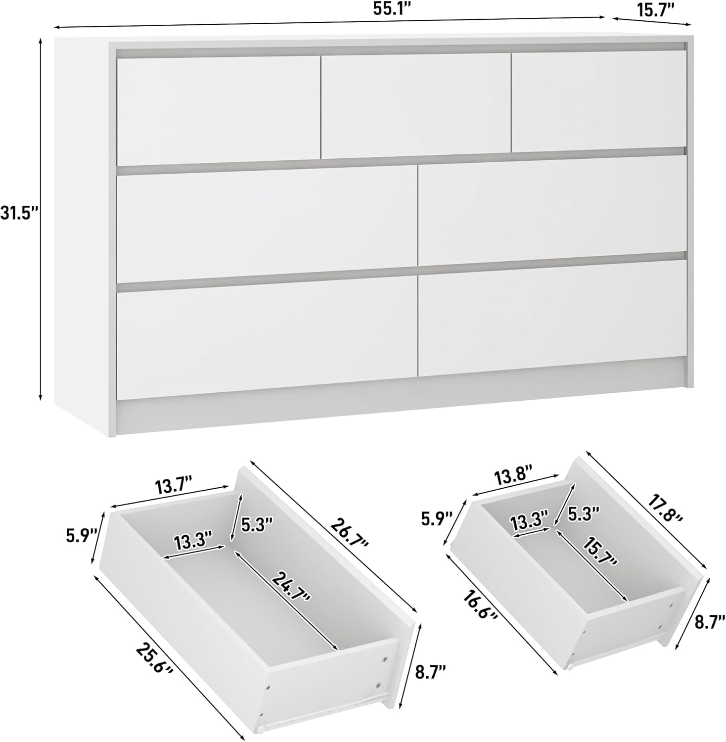 - 【Spacious interior】Overall size:55.1"D x 15.7"W x 31.5"H. Drawers dimensions: 26.8"D x 14" W x 8.7"H and 17.8"D x 14" W x 8.7"H. With 4 large drawers and 3 medium drawers with a depth of 5.9 inches, it is easy to organize your things and keep the room clean and tidy. The roomy top for placing your favorite picture frames, flowers and cute decorations