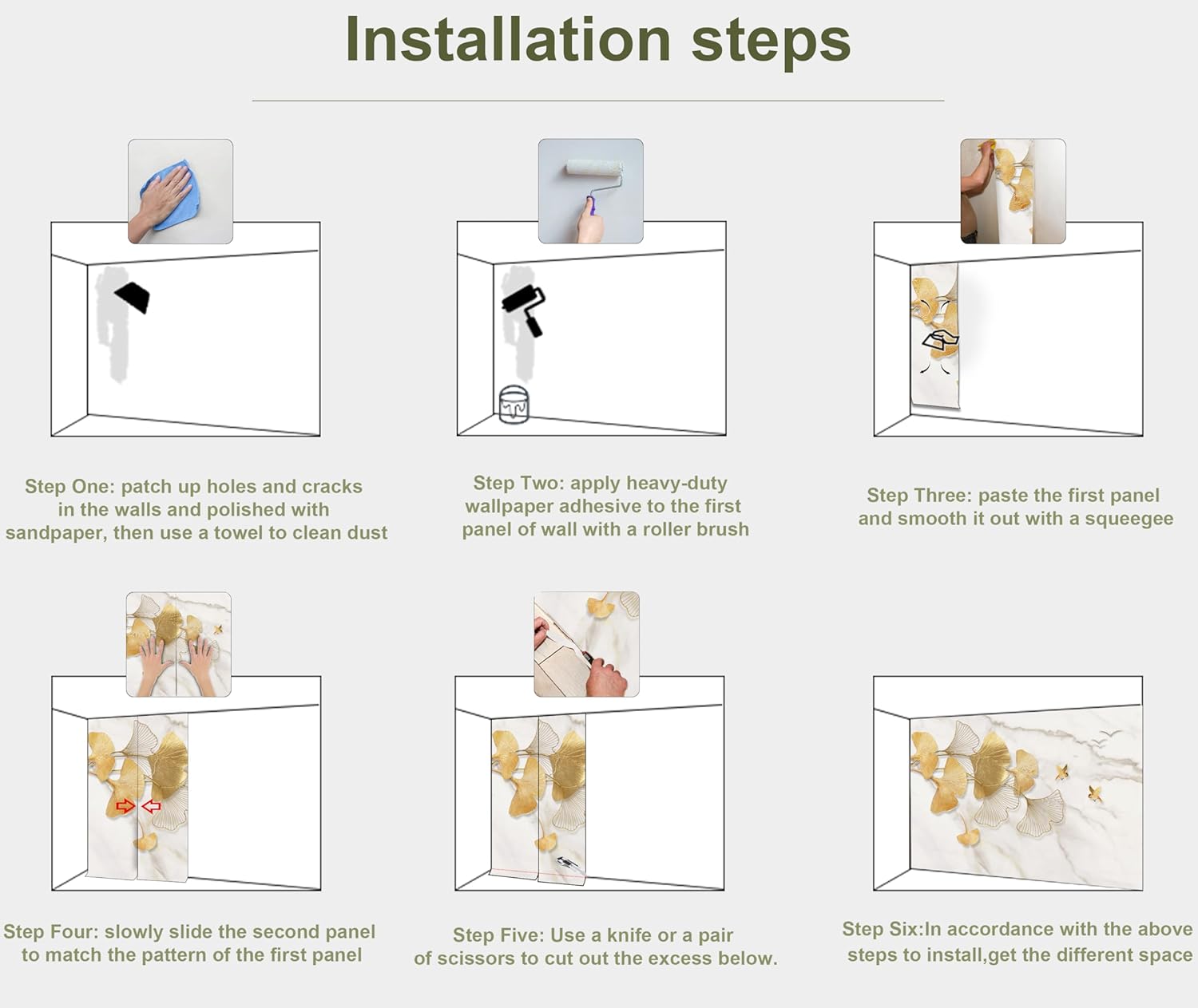 - INSTALLATION - 1.Fill in all cracks or holes and clean dust dirt and grease on the wall surface. 2. Apply the heavy duty wallpaper paste on the wall not mural. 3. Use a spirit level to mark first strip location. 4. match the pattern by sliding into place. 5.use a scraper to smooth out bubbles press. 6. Let dry for a few minutes and that's it! Please Note: Not self-adhesive. We recommend to use a standardized fleece wallpaper paste.