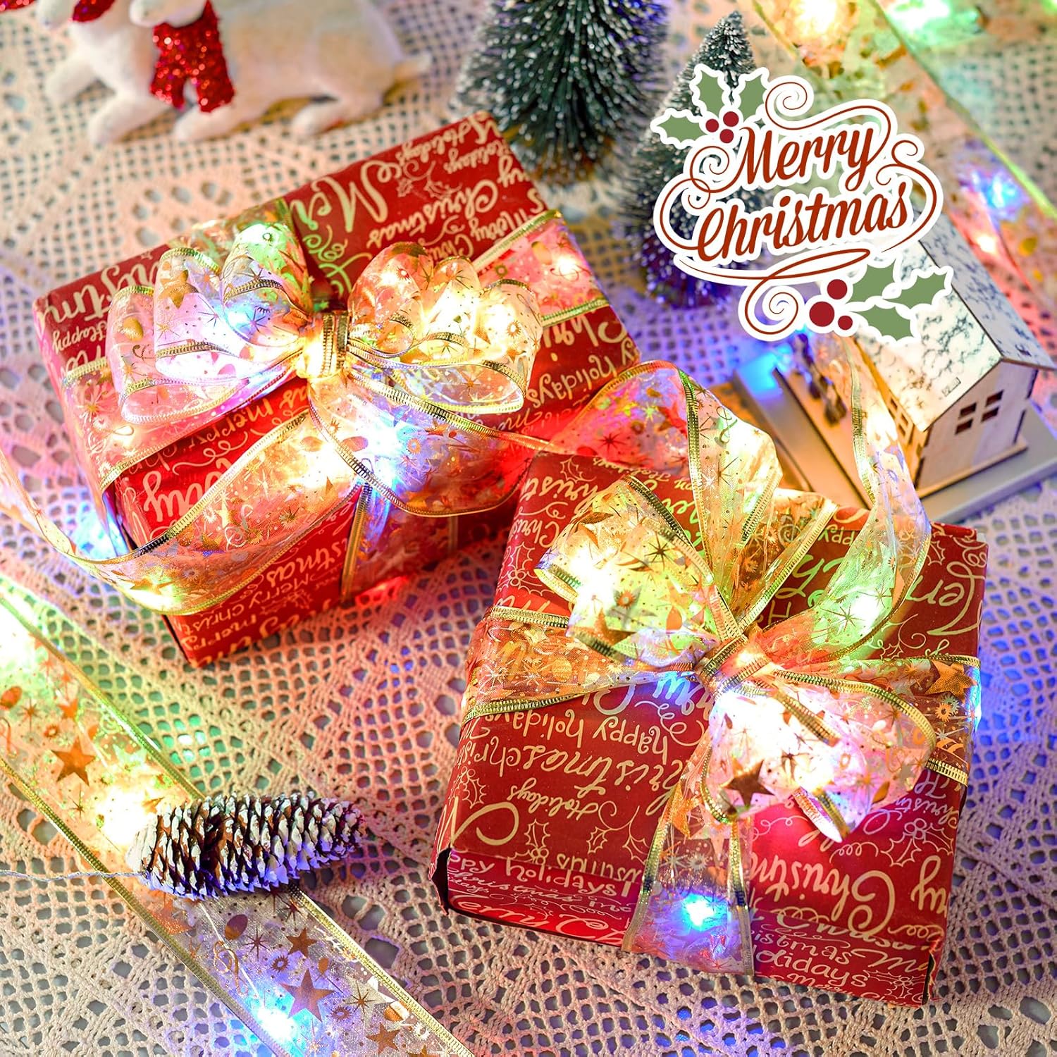 - 【 Christmas Ribbon String Lights 】- Powered by 3 × AA batteries, these ribbon string lights specially designed for Christmas trees are 33 feet long with 100 bright multi-color LEDs on a 2-inch-wide Gold ribbon. The beautiful ribbon pattern and medium-sized LED bulbs add a cheerful and romantic touch to your Christmas Tree.