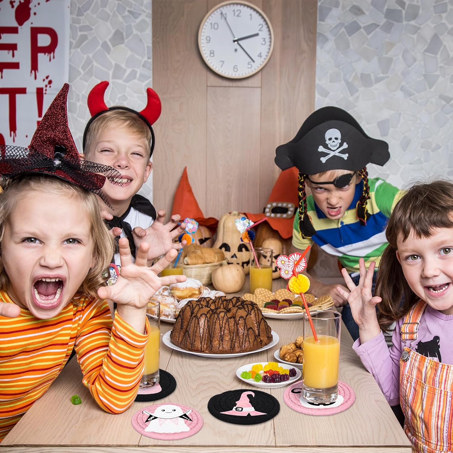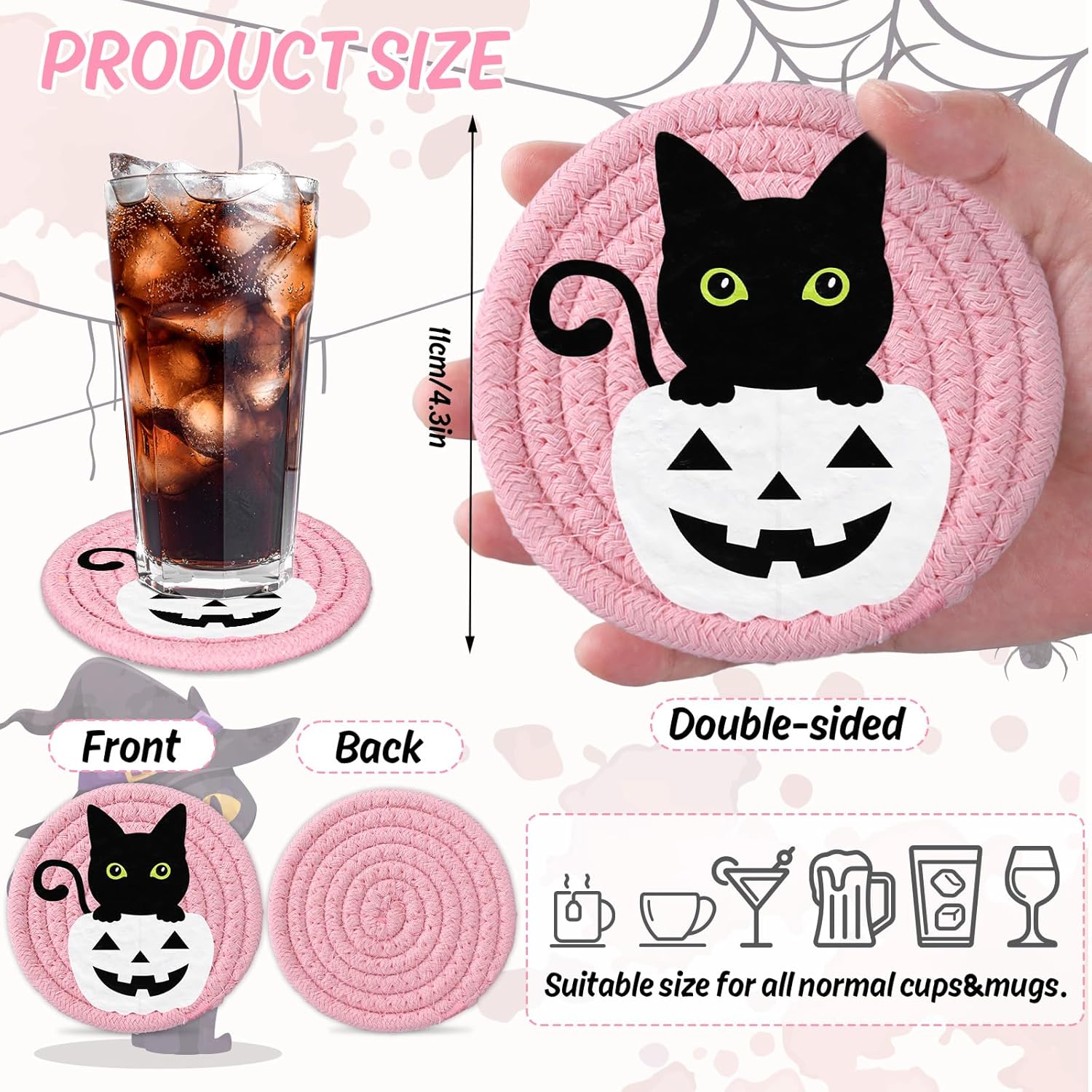 - Halloween Theme - Our drink coasters featuring Halloween theme, designed with ghost, pumpkin, cat, candy corn, witch hat and the word of boo, mainly colored in pink and black, cute and delicate, will nicely increase fun and festive atmosphere.