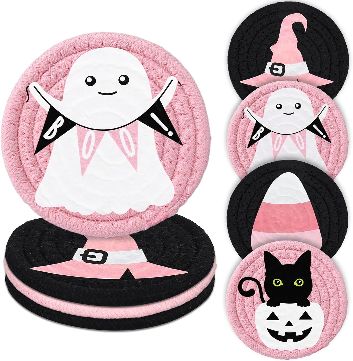 Whaline Halloween Handmade Braided Cotton Coasters Pink Cute Ghost Boo Black Cat Drink Coasters Absorbent Cup Coasters for Halloween Party Home Office Decor, Set of 4