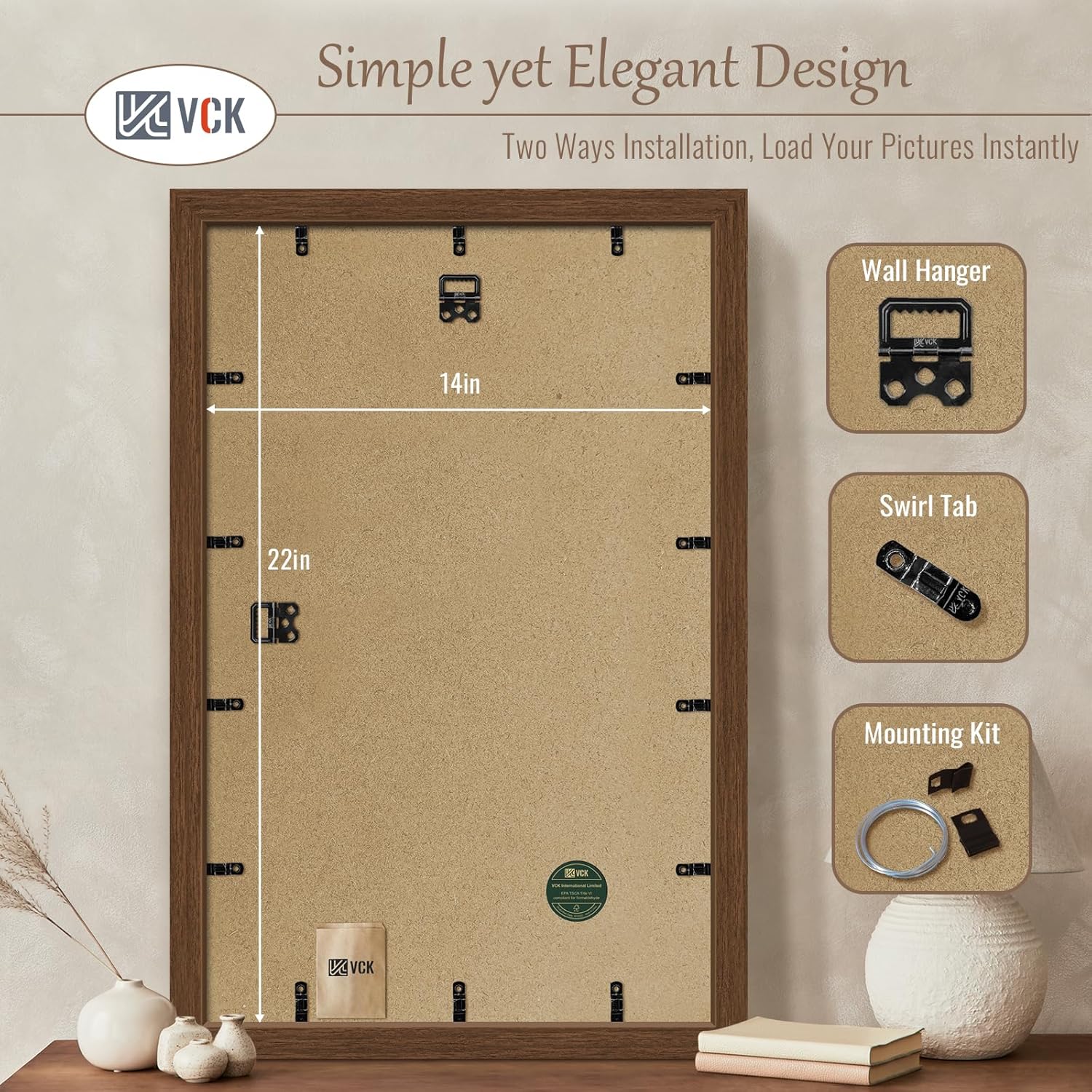 - Elegant Charm: VCK brown wood-grain picture frame. Drawing inspiration from Appalachian ancient forests, seamlessly blends modern minimalist design with natural aesthetics. This versatile addition enhances any decor, elevating the aesthetic value of your space