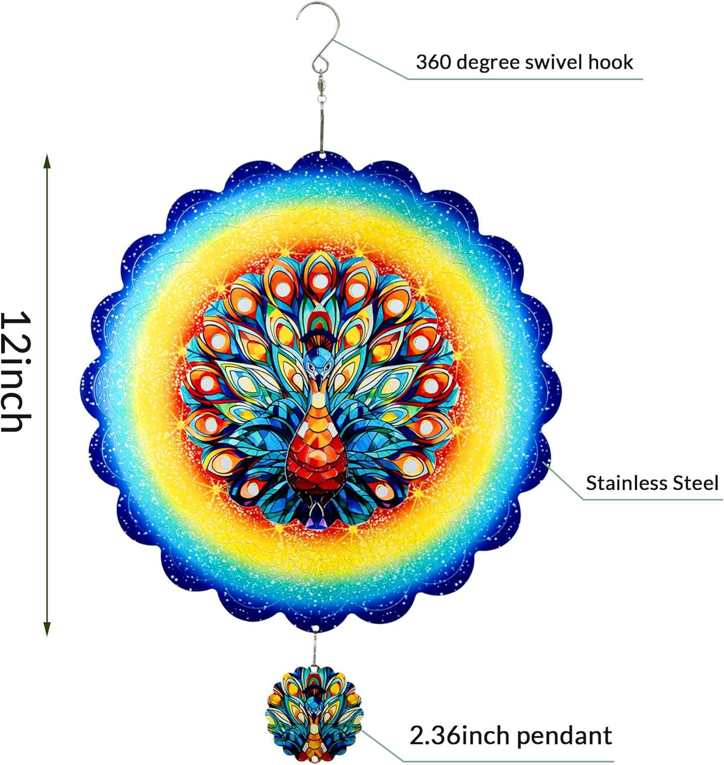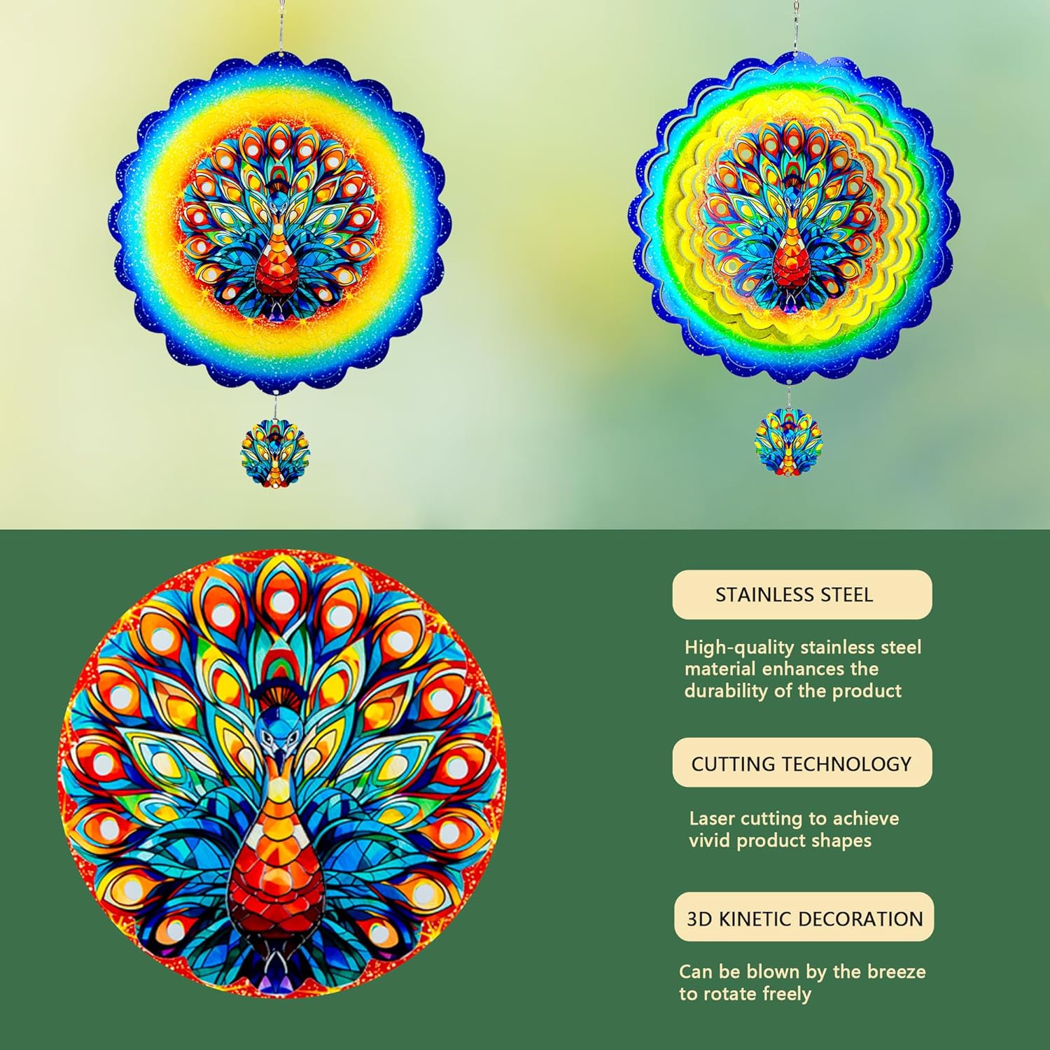 - 【Product introduction】: This 3D wind spinner is made of 12 inches and made of high-quality stainless steel. which adopts cutting technology and PUV printing to achieve a vivid peacock shape.