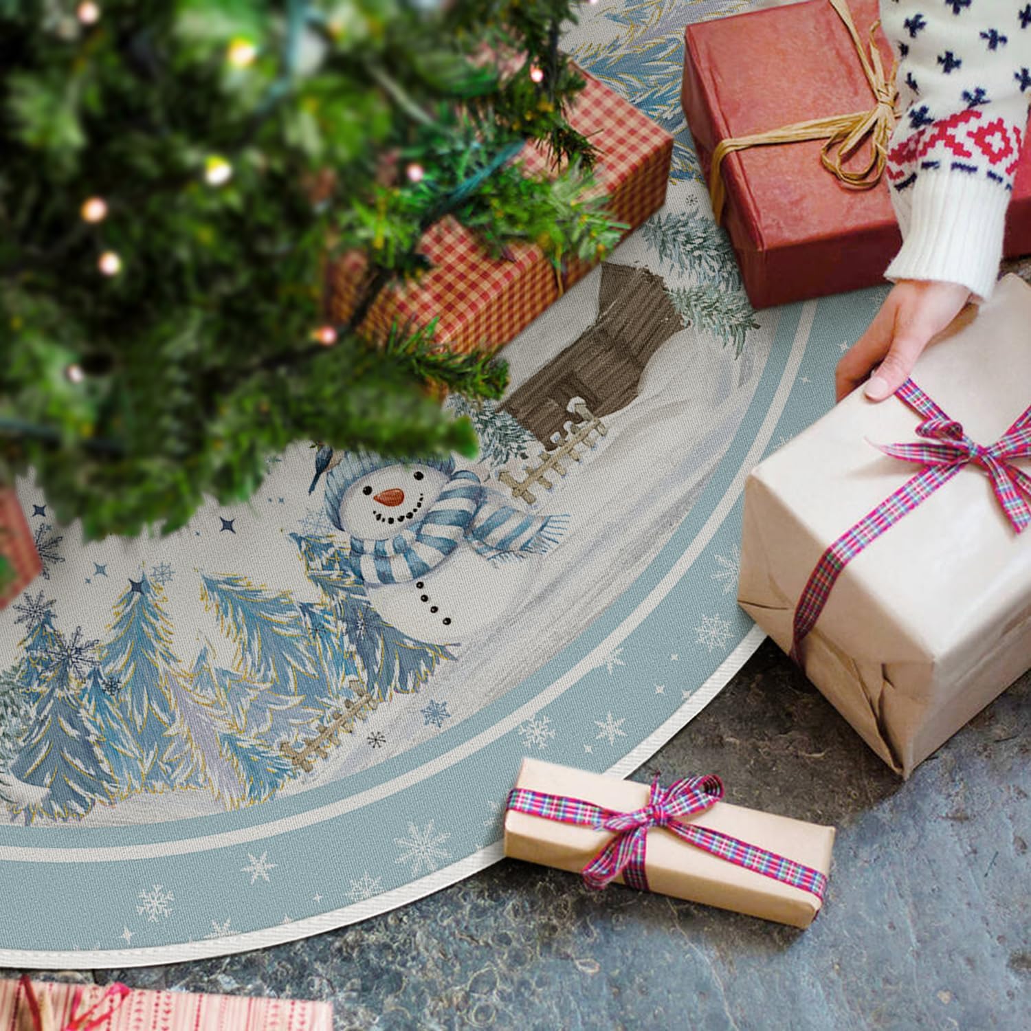 AVOIN colorlife Snowflake Snowman Cardinal Christmas Tree Skirt 48 Inch, Winter Holiday Tree Mat Decoration