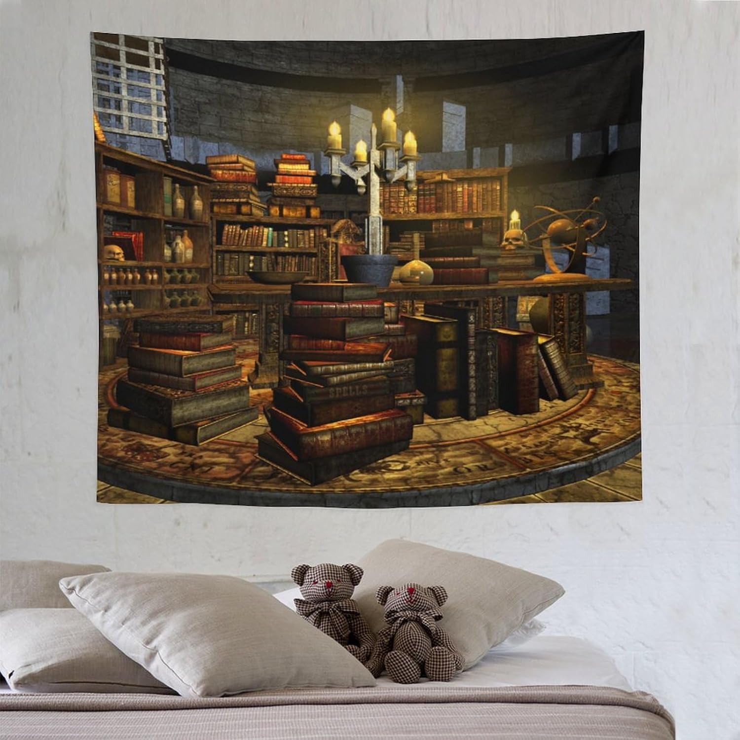 Kurtect Library Tapestry,Vintage Medieval Bookshelf Wooden Bookcase Antique Magic Art Tapestries for Party Beach Picnic Blankets Tablecloths Living Room Wall Deocr, 50x60 in