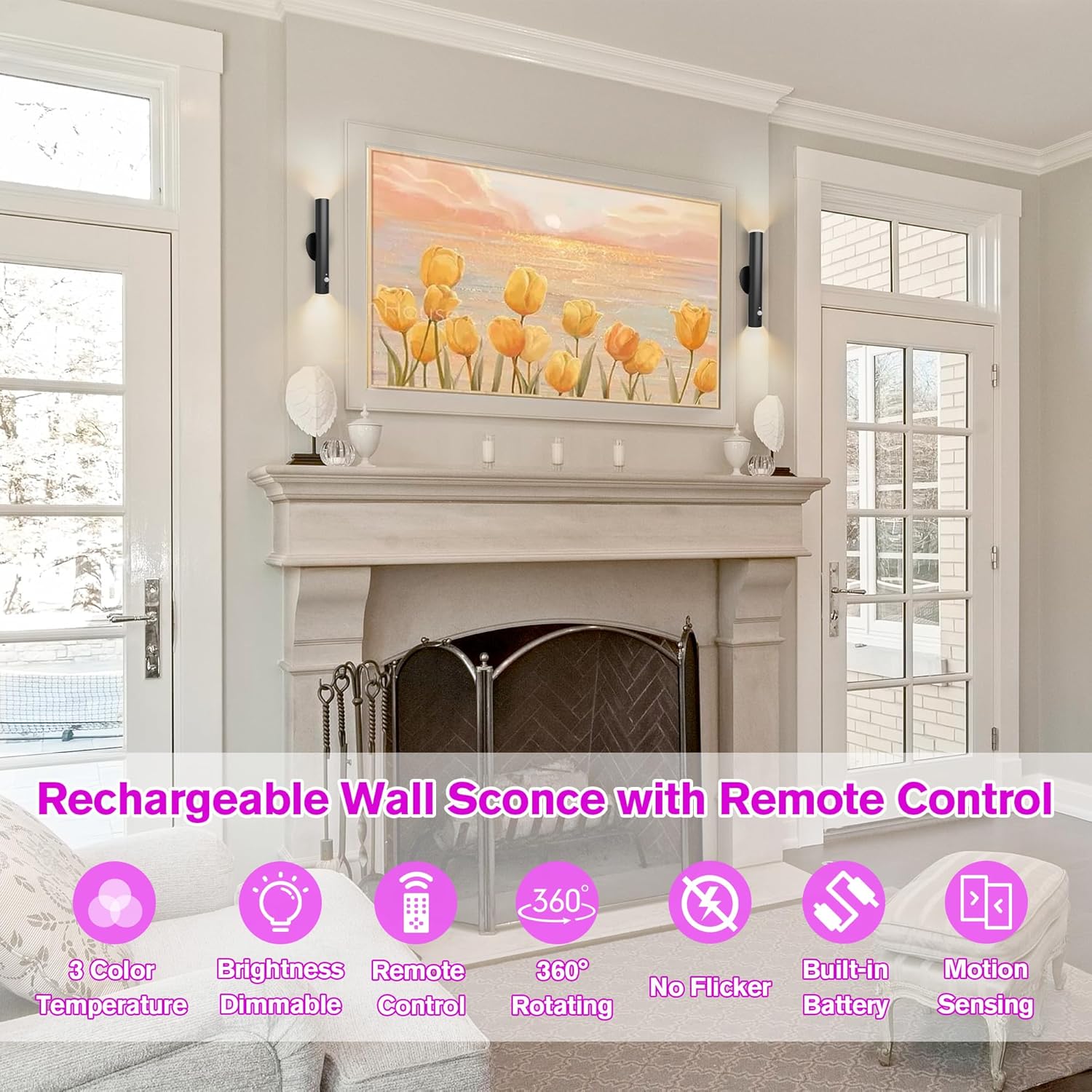 Battery Operated Wall Sconce Set of Two, Rechargeable Wall Lights with Motion Sensor, Remote Control, Dimmable Metal Magnetic Wall Lamp for Decor, Bedroom, Night Light (Black, 2 Pcs)