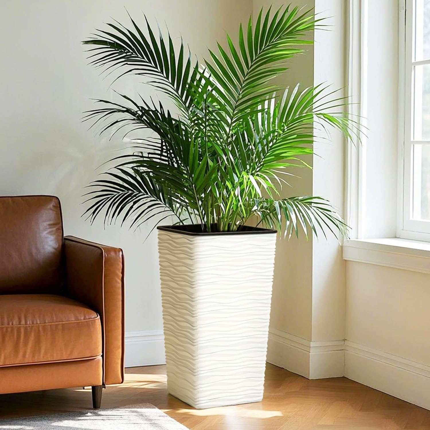 Worth Garden 2-Pack 22" H. White Square Tapered Planter with Inside Pots - Plastic Plant Pots for Indoor Outdoor - Modern Wavy Finish Decorative Flower Pots for Front Porch Containers Patio Deck