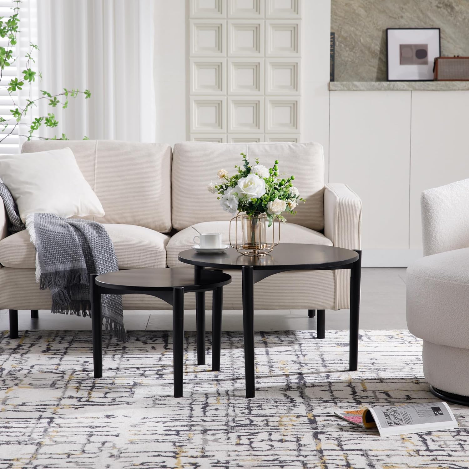 Wooden Round Modern Nesting Coffee Set of 2, Round End Table Side Table, Stacking Living Room Accent Tables for for Living Room Bedroom Balcony, Black