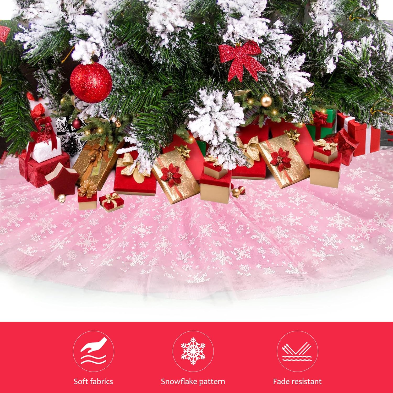 - Premium Material:This Xmas tree skirt is made of high quality material with 4 layers;1 layer of snowflake patterned tulle,2 layers of sheer tulle, and a layer of polyester fabric;fluffy material will make Christmas tree transform into a lovely princess