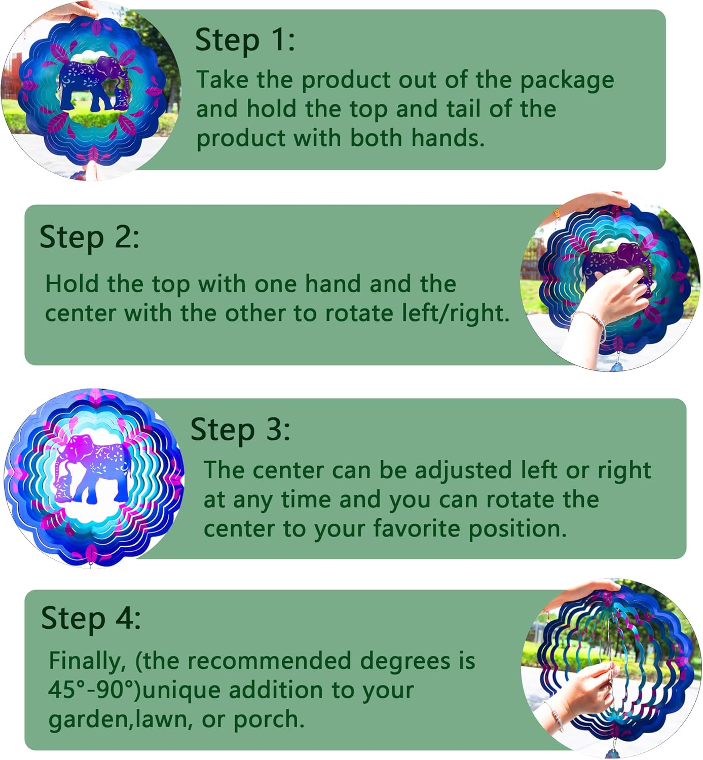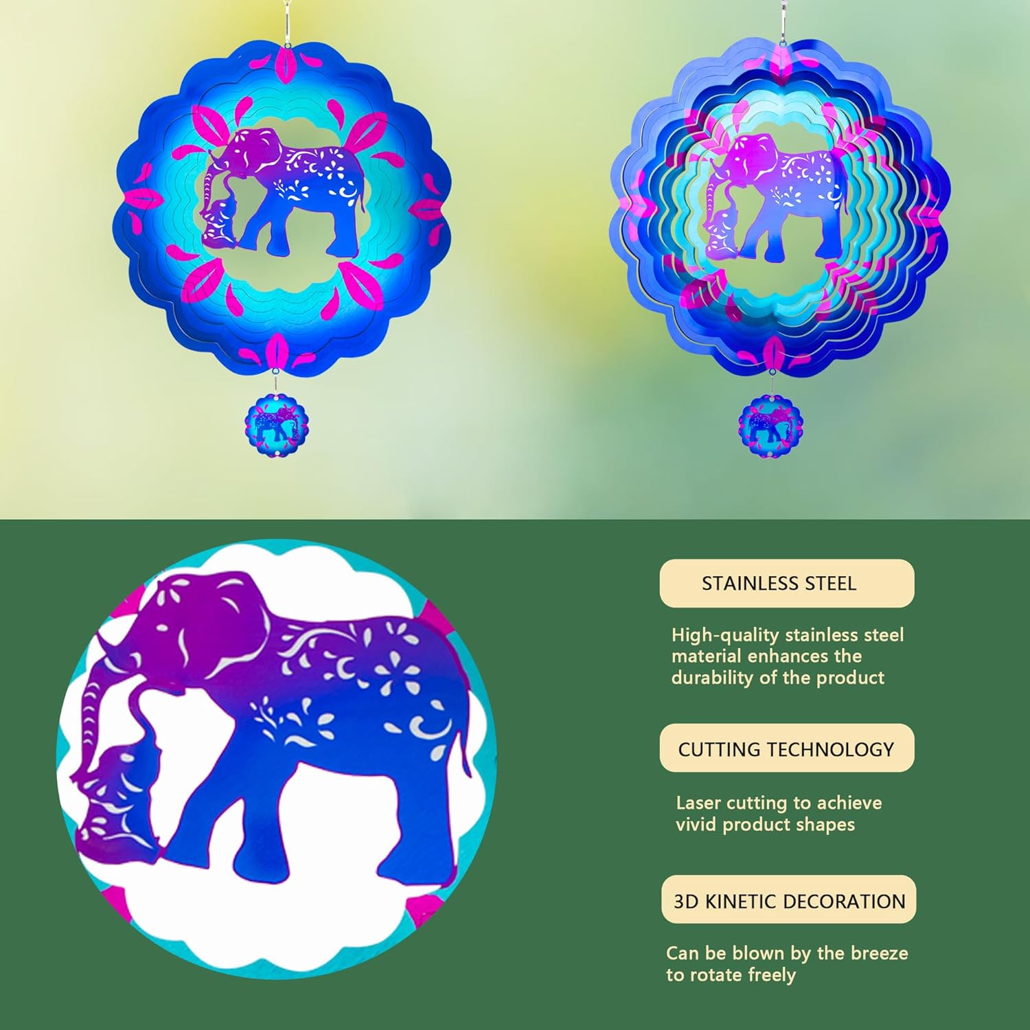 - 【Product introduction】: This 3D wind spinner is made of 12 inches and made of high-quality stainless steel. which adopts cutting technology and PUV printing to achieve a vivid elephant shape.
