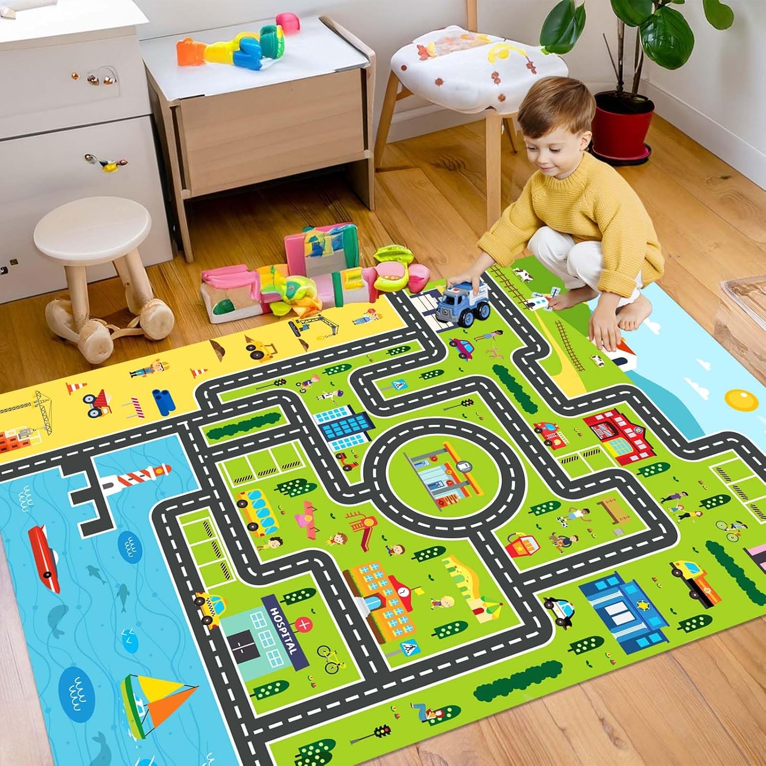 - 【Unlimited Happiness】: Our city themed play rug set helps your child enjoy endless educational fun with its unique city life design and wonderful colors! It is ideal for promoting children's hand-eye coordination, motor skills, pretend play and narrative role-playing skills! It is a perfect gift for holiday toys, school classroom prizes and smart learning toys