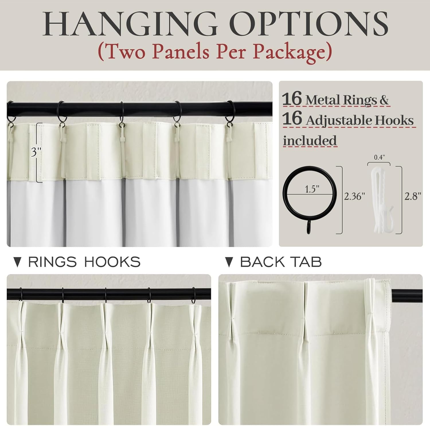 - Ready Made:Set of 2 pinch pleated curtain panels per package with 16 metal rings and 16 adjustable plastic hooks(The adjustable hook can raise and lower the height of the curtain by 1 inch),Each panel measures 40"W x 45"L,pair measures 80"W x 45"L